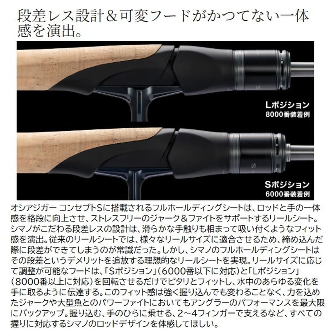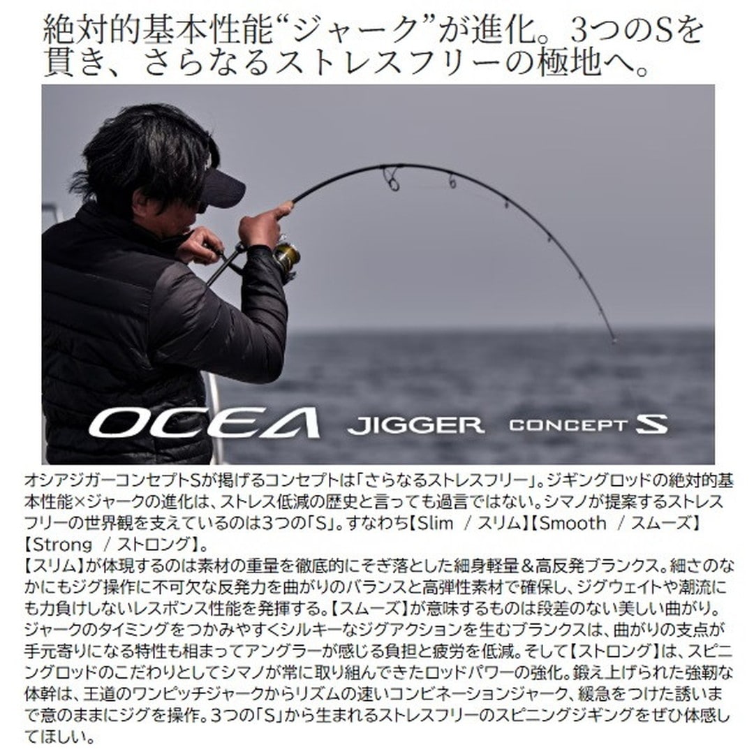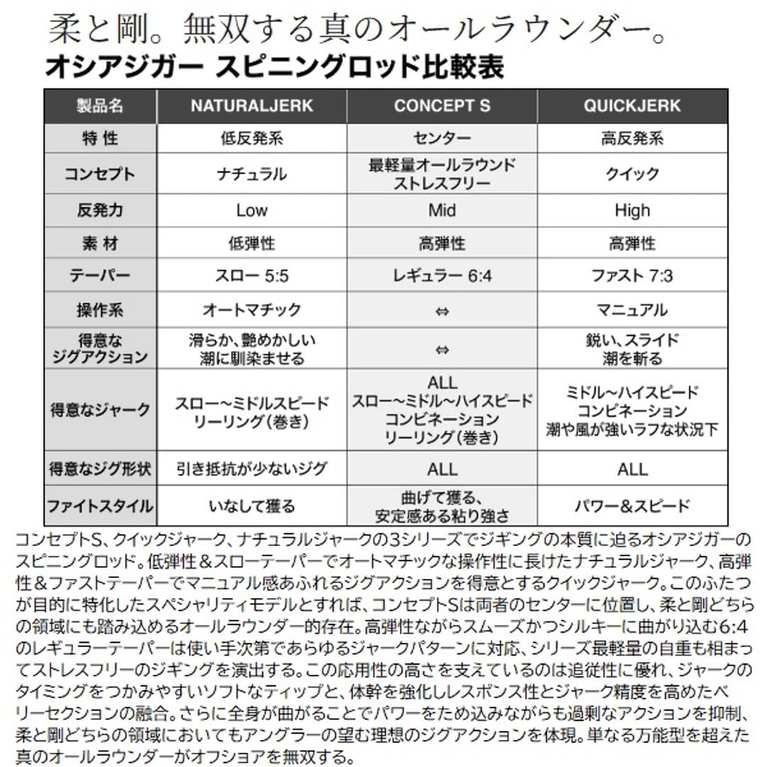 ストレスフリーを追求するスピニングジギングロッドの中核。ジギングの絶対的基本性能ジャークの進化を遂げた「オシアジガー コンセプトS」。■S60-5・・・大物&深場対応のストロングモデル。水深60~140m+αを想定。深場の攻略、潮流の速いエリア、積極的にジグを操作したいシーンなどで活躍。レングスを長すぎない6フィートに設定することで、高負荷時におけるアングラーのストレスを低減。曲がれば曲がるほど強大なパワーを発揮。大型青物の強烈な引きを制御し、アングラー優勢のファイトでランディングへと持ち込めます。