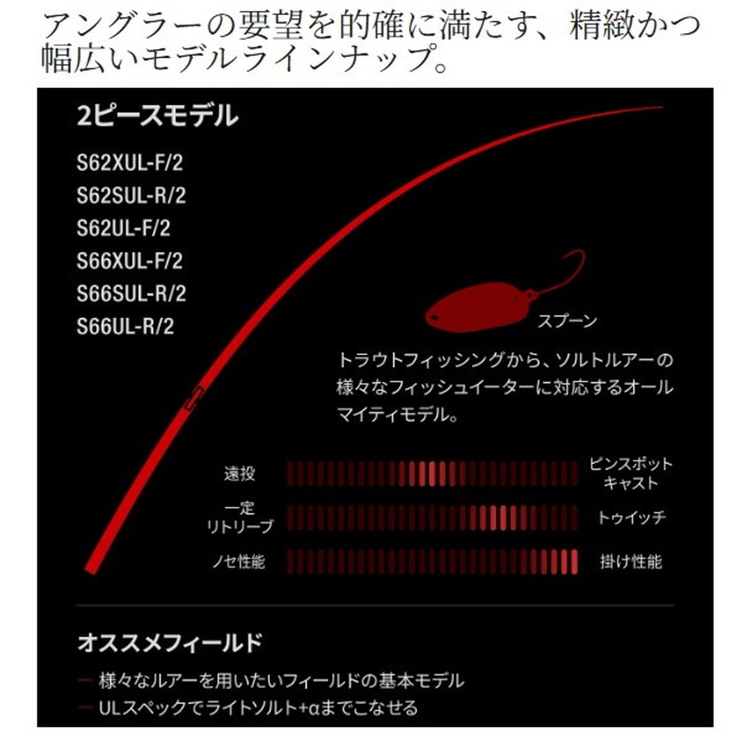 その曲がりすら美しい。ターゲットを魅了する豊かな曲がりで描く、テクニカルロッドの新境地。■S64SUL-R/3・・・インロー継等長3ピース設定でロッドパワーを維持しつつ、バラシを極限まで抑えるどこまでも美しい曲がりを追求したモデル。ファイトがアグレッシブなターゲットをしっかりとキャッチまで到達させることが可能。