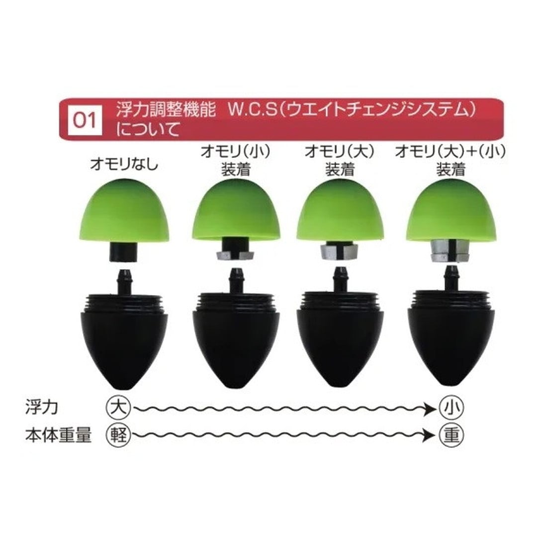 ウキの浮力をクイックチェンジ!多目的用途ウキ。●糸を切らずに浮力が変えられる、W.C.S(ウエイトチェンジシステム)採用。浮力調整用内蔵オモリを大小各1個ずつ付属。それぞれを着脱することでウキの浮力・重量を変えることが可能です。オモリには割り溝が入っているため、道糸を切らずに浮力調整を行えます。1個のウキで4浮力分をカバーするマルチパーパスモデルです。●最大で1号相当の重量調整が可能なので、食い渋り対応のシブシブ浮力から高視認状態まで調整可能。オモリを全く入れない状態から大小両方の内蔵オモリをセットした状態までの間で、オモリ約1号分の範囲内での浮力調整を行えます。タナや視認性など、お好みの狙い方・釣り方に応じてフレキシブルな対応が可能です。●更にガン玉などのオモリを追加で入れれば、沈め釣り用など自分の好みの浮力に微調整可能。ウキ内部にそのままガン玉を追加で入れることにより、更に浮力の微調整が可能です。ラインにガン玉は打ちたくない、でもウキの浮力は減らしたい・・・そんな場合にも最適です。