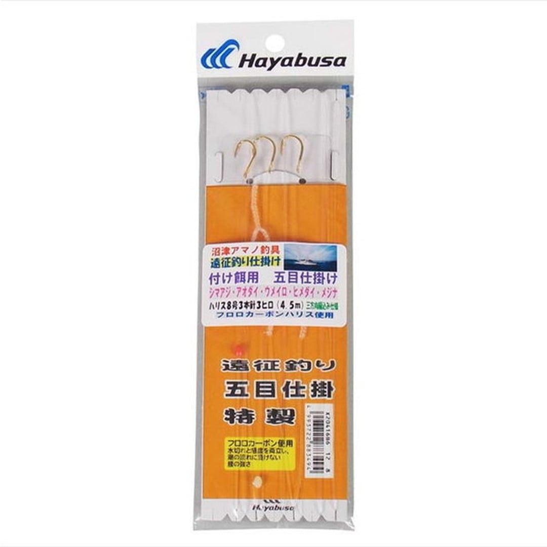付け餌用遠征五目仕掛 3本針 空針 4.5mイカタンやオキアミを付けて使用します。五目釣りに最適の仕掛けで、喰い渋ったときに効果がでます。三方向編込み仕様・フロロカーボン使用