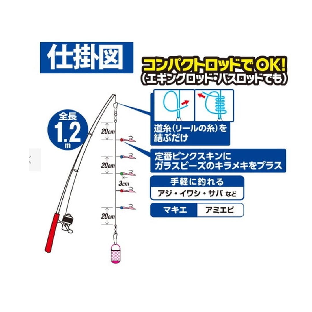 初めてのサビキ釣りでも安心!かんたんで便利なコンパクトロッド対応サビキ釣りセット!堤防でのサビキ釣りをかんたんで便利に楽しめるようサビキ釣り仕掛と下カゴ式どんぶりカゴをセットしました。仕掛の全長は1.2mと短く、コンパクトロッドに対応しています。疑似にはアミエビをイメージしたド定番のピンクスキンを採用し、アミエビと見事に海中で同化させます。「かんたん」で「しっかり釣れる」サビキ釣りセットです。