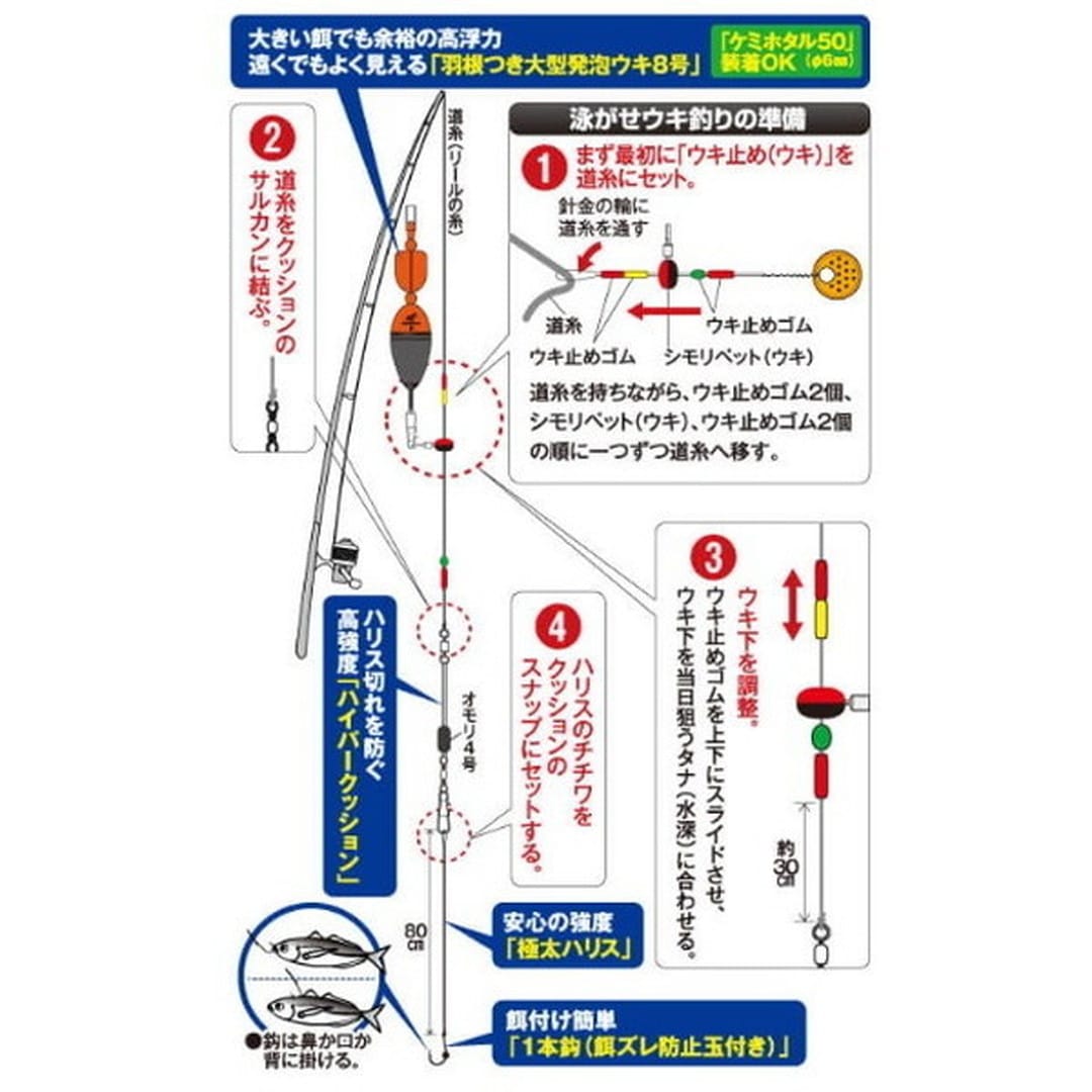 海上釣り堀もOK。ケミホタル50装着OK。アジやイワシを餌に青物をマジで狙おう!大きな餌でも余裕の高浮力、遠くでよく見える「羽根付き大型発泡ウキ8号」。安心の強度「極太ハリス&ハイパークッションゴム」。餌付け簡単「1本鈎(餌ズレ防止玉付き)」。