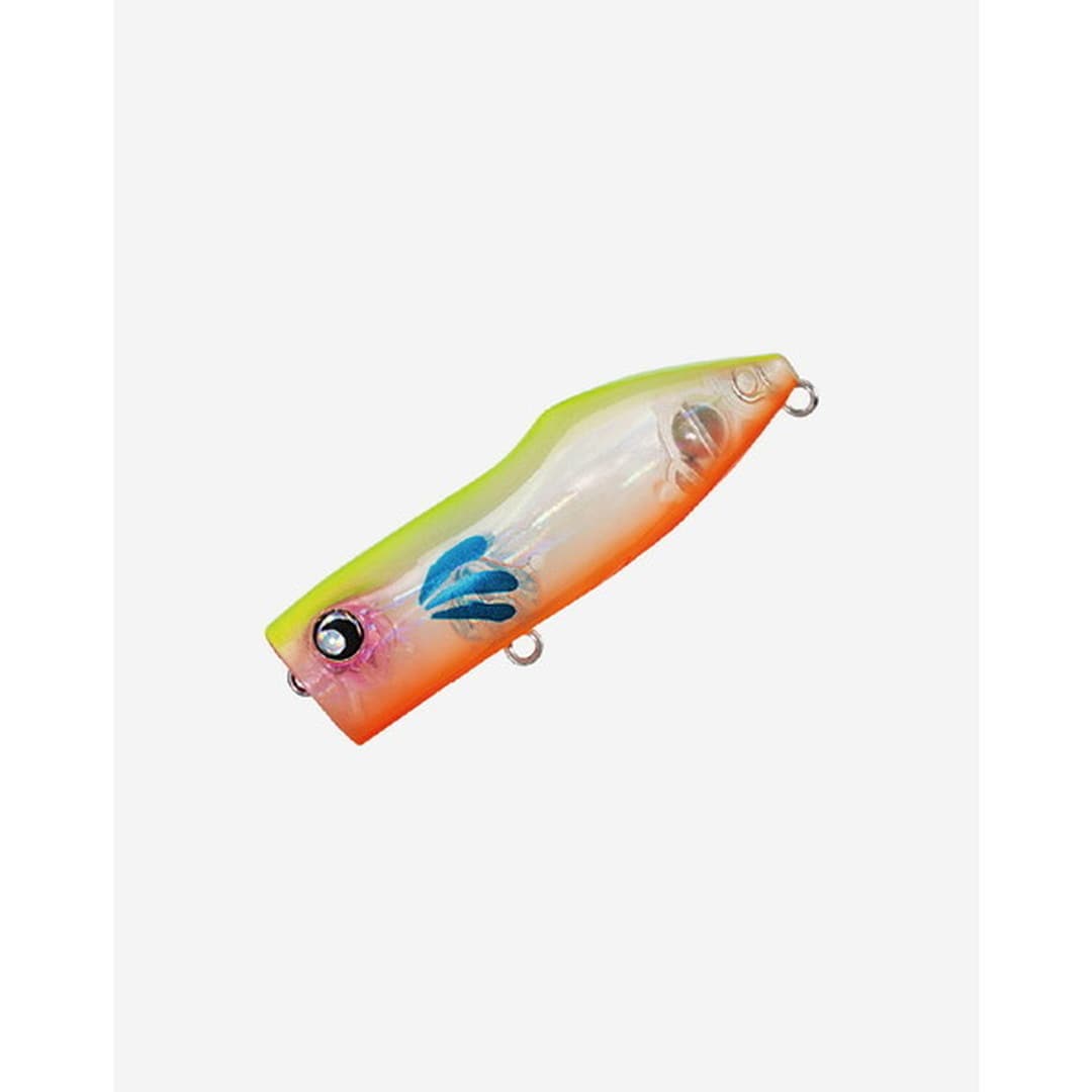 [誘う・ネチる・泳ぐ]多彩な次の一手で食わせる。チヌ・シーバスに主眼を置いて開発。小場所やサイト等「興味は持つけど喰わせるまで至らない」スレた個体や壁チヌのように極めて追う距離が短い個体に対して有効な1本。3アクションを組み合わせる事でその日のストライクゾーンを幅広く探す事が可能。[誘う]移動距離を抑え直下にダイブするような低音のポッピング。ストップ感が強く、まとった泡や水押しの中にルアーが浮上してくる挙動。[ネチる]ターンに近い移動距離を抑えた細かな首振り。誘った後の追いが悪い場合やストラクチャー際から離さずに誘い続ける場合に有効。[泳ぐ]スローからファストまで水面下5cmをフラフラと泳ぐウォブリングアクション。ラインの揺れを嫌うスレたチヌやシーバスにおけるイナッコパターン等に。