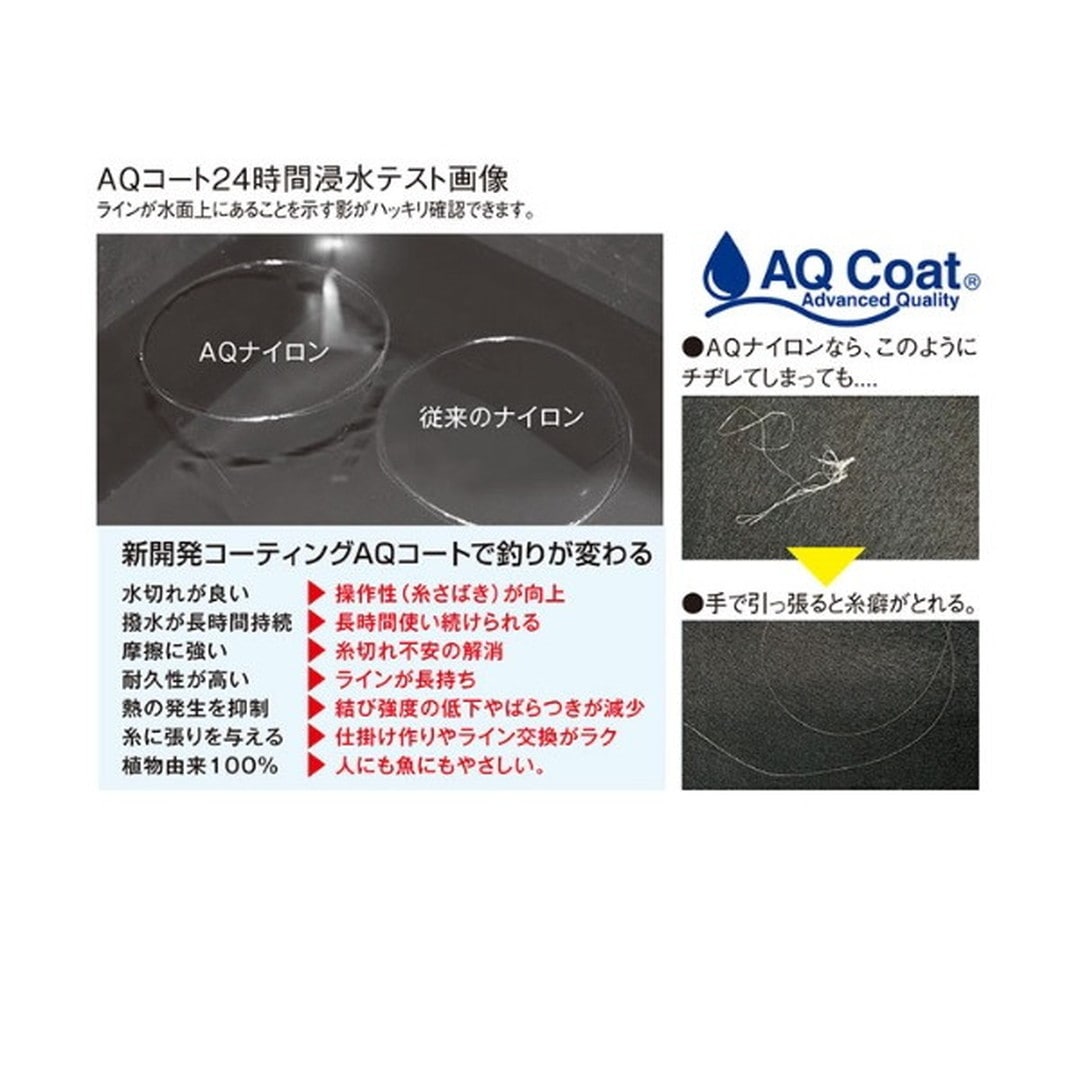 ハナカン回りのトラブルを解決したAQコートラインにフロロが新登場!!(フロロカーボンの特徴)●吸水性が無く、長時間使用しても吸水による強度の劣化がありません。●フロロカーボンラインにAQコートで強力にコーティング。石ズレなどによるラインの痛みを抑え、高い性能を保持します。