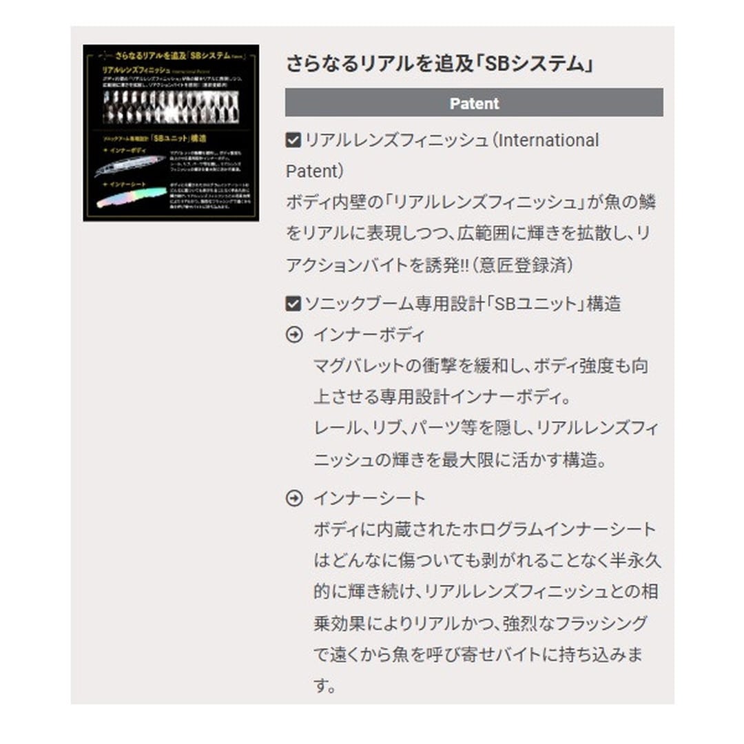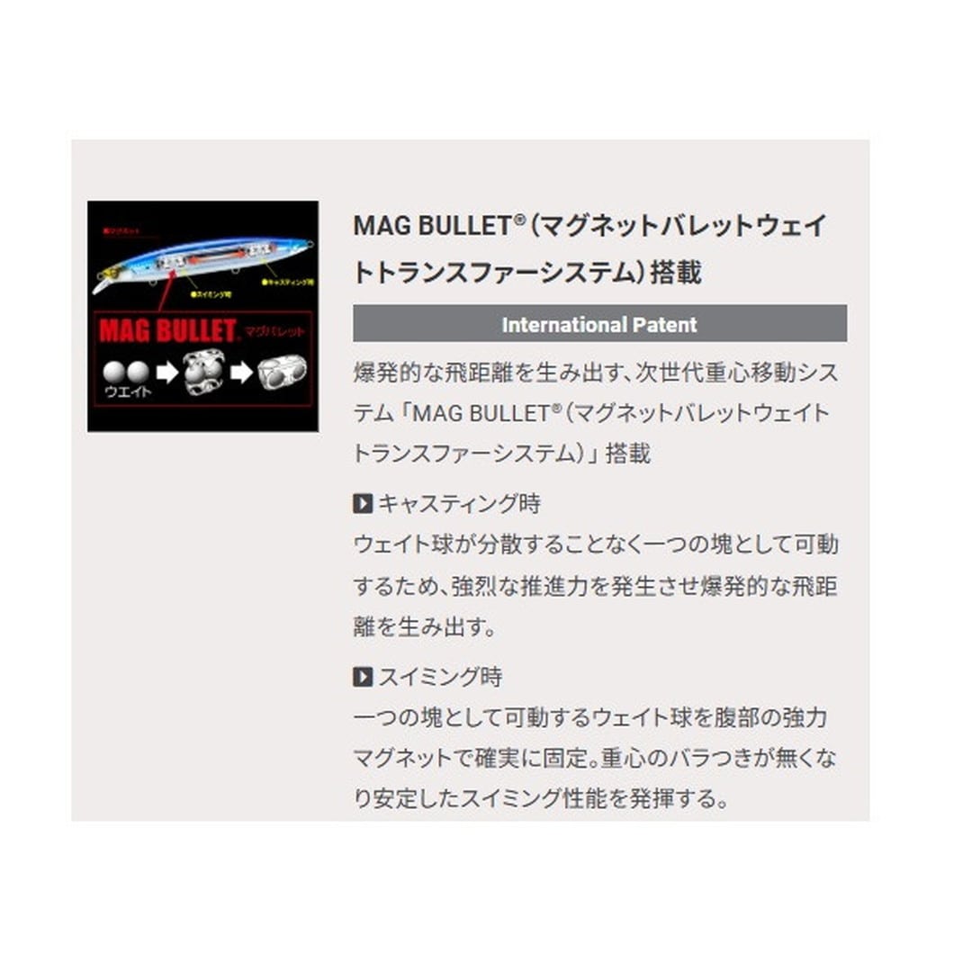 爆発的飛距離+レンズの閃光!(International Patent)遥か彼方のターゲットを狙い撃つ!!磯、サーフ、河川と様々な状況に対応する新スタンダードミノー!●爆発的な飛距離を生み出す、次世代重心移動システム「マグバレット」 搭載●ショートバイトも確実に獲る3フック仕様と、大物対応の#4フック搭載●PE2号ラインでもしっかり泳ぐウォブンロールアクション