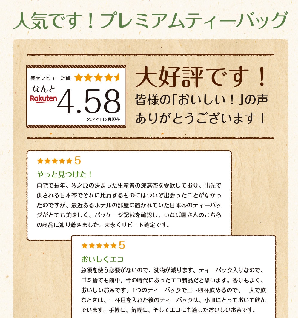 名称 煎茶 原材料名 緑茶 原料原産地名 静岡県産 内容量 2g×20包 保存方法 高温多湿を避け移り香に注意してください。 製造者 株式会社いなば園 東京都中央区日本橋2-16-13 製造所 株式会社いなば園 静岡工場 静岡県牧之原市須々木2536-1 注意事項 お茶は鮮度が大切です。 開封後は早めにお飲みください。 新鮮な風味を守るために、開封後はチャックを閉じて冷蔵庫で保存することをおすすめします。