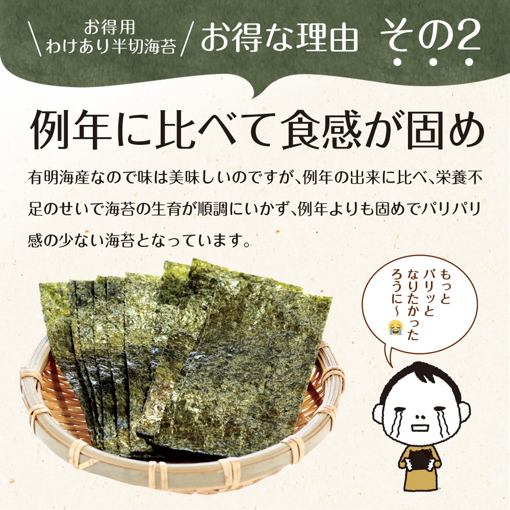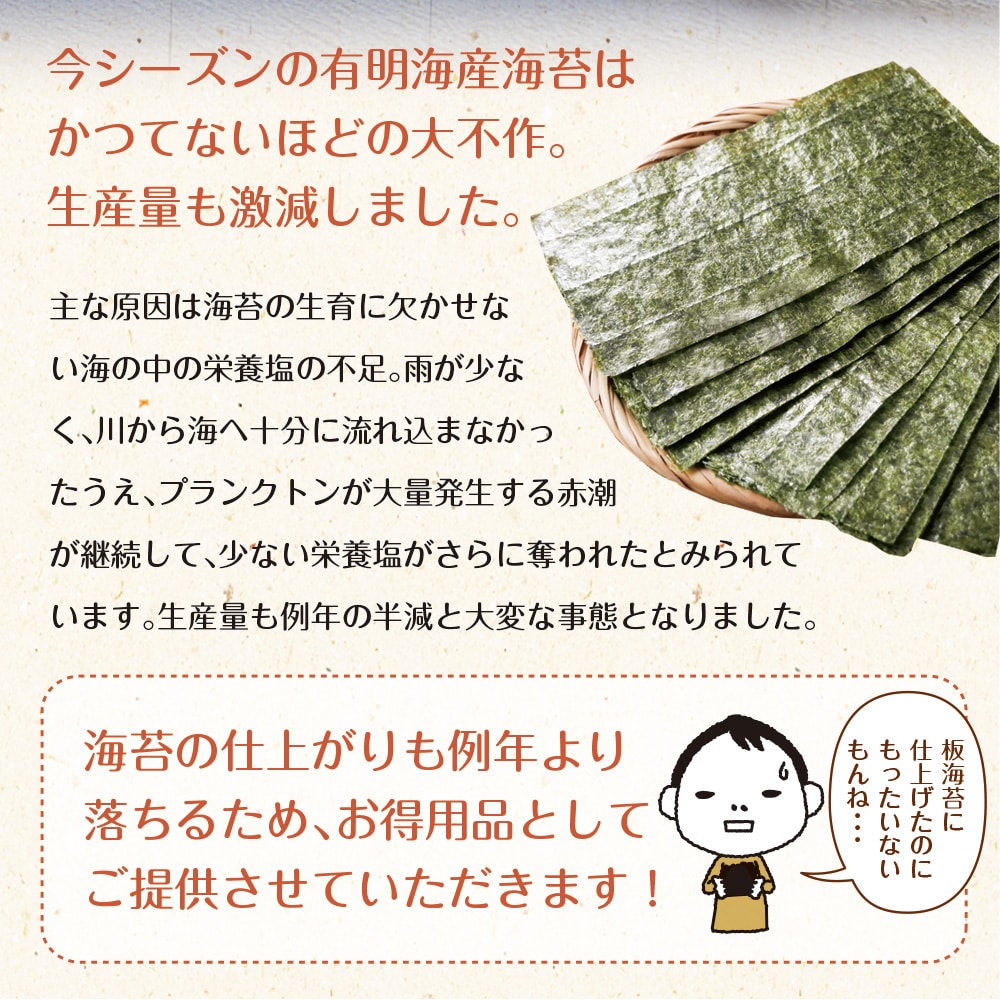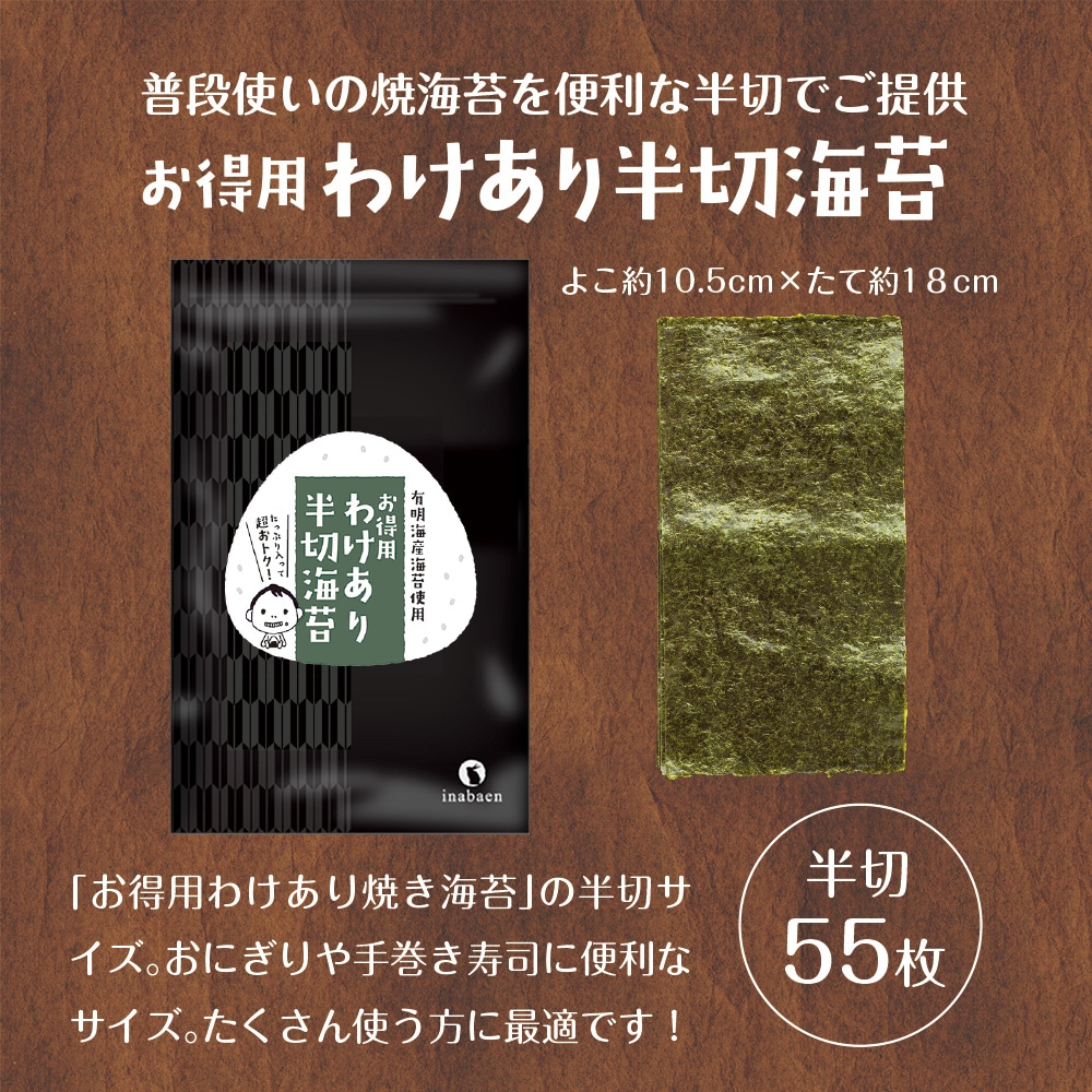 ※海苔は自然のものです。ひとつひとつ品質が異なります。また訳あり品の特性上、穴や、ヒビ、割れ、欠け、厚みのバラツキがございます。予めご了承の上ご注文ください。 名称 焼海苔 原材料名 乾海苔(有明海産) 内容量 半切55枚(板のり27.5枚分) 保存方法 直射日光、高温多湿を避けて保存して下さい 製造者 株式会社いなば園 東京都中央区日本橋2-16-13 注意事項 原材料の乾海苔は「えび・かに」の生息する海域で採取しております。 本品は防湿の為に乾燥材を封入しております。食べられませんので、ご注意ください。 開封後はなるべく早くお召し上がりください。