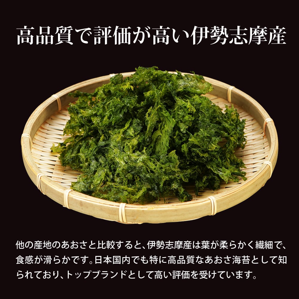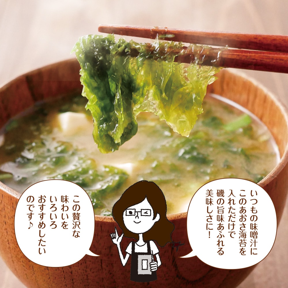 名称 あおさ 原材料名 ヒトエグサ(三重県産) 内容量 30g 保存方法 高温多湿、直射日光を避け、冷暗所で保存してください。 変色しやすいため、冷蔵庫での保存をおすすめします。 販売者 株式会社いなば園 東京都中央区日本橋2-16-13 栄養成分表示(100gあたり) エネルギー 130kcal たんぱく質 22.1g 脂質 0.6g 炭水化物 41.7g 食塩相当量 9.9g ※推定値 注意事項 あおさは、エビ・カニの生息する地域で養殖されております。 まれに雑海藻や小エビ等が付着している場合がございますので、取り除いてご使用ください。