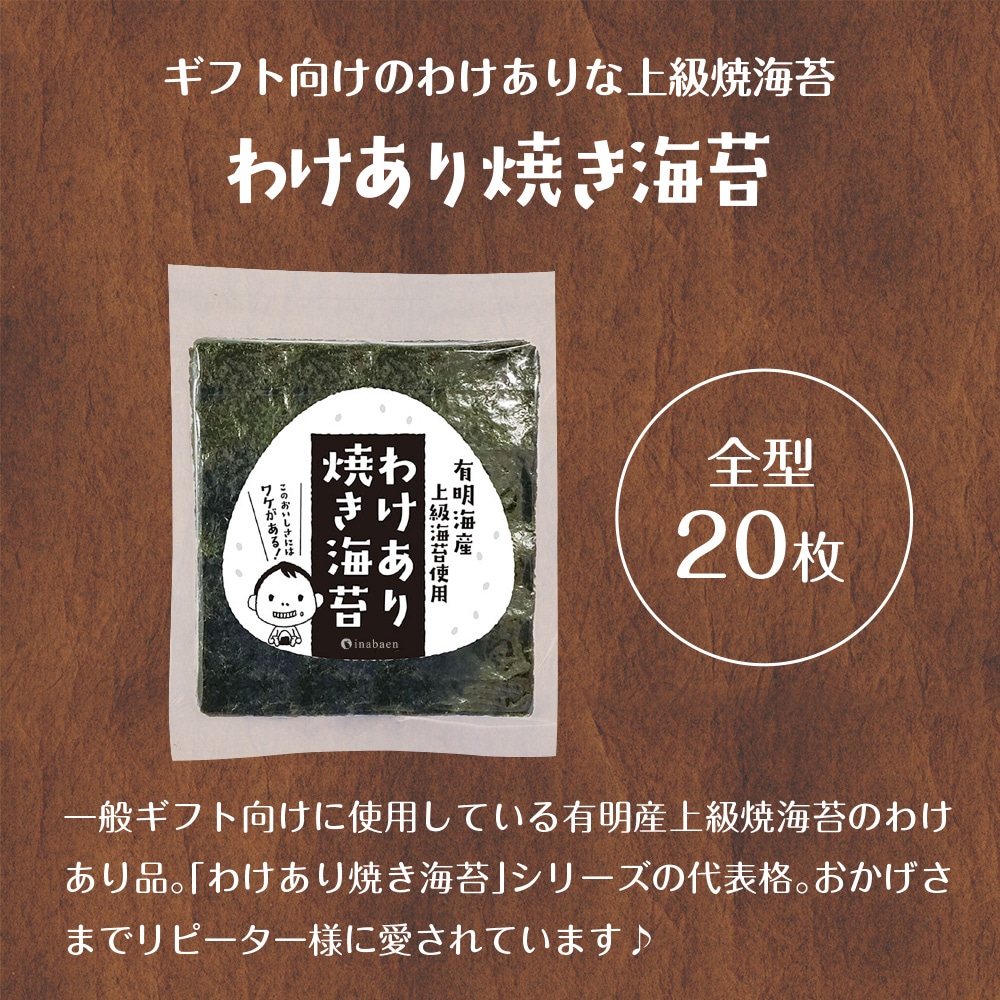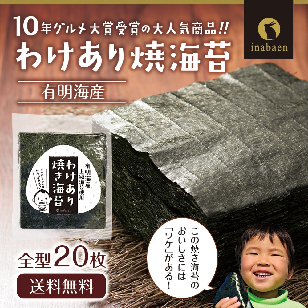 ※内容量が変更となっております。ご確認の上、お買い求めください。 ※海苔は自然のものです。ひとつひとつ品質が異なります。また訳あり品の特性上、穴や、ヒビ、割れ、欠け、厚みのバラツキがございます。予めご了承の上ご注文ください。 名称 焼海苔 原材料名 乾海苔(有明海産) 内容量 板のり20枚 保存方法 直射日光、高温多湿を避けて保存して下さい 製造者 株式会社いなば園 東京都中央区日本橋2-16-13 注意事項 原材料の乾海苔は「えび・かに」の生息する海域で採取しております。 本品は防湿の為に乾燥材を封入しております。食べられませんので、ご注意ください。 開封後はなるべく早くお召し上がりください。