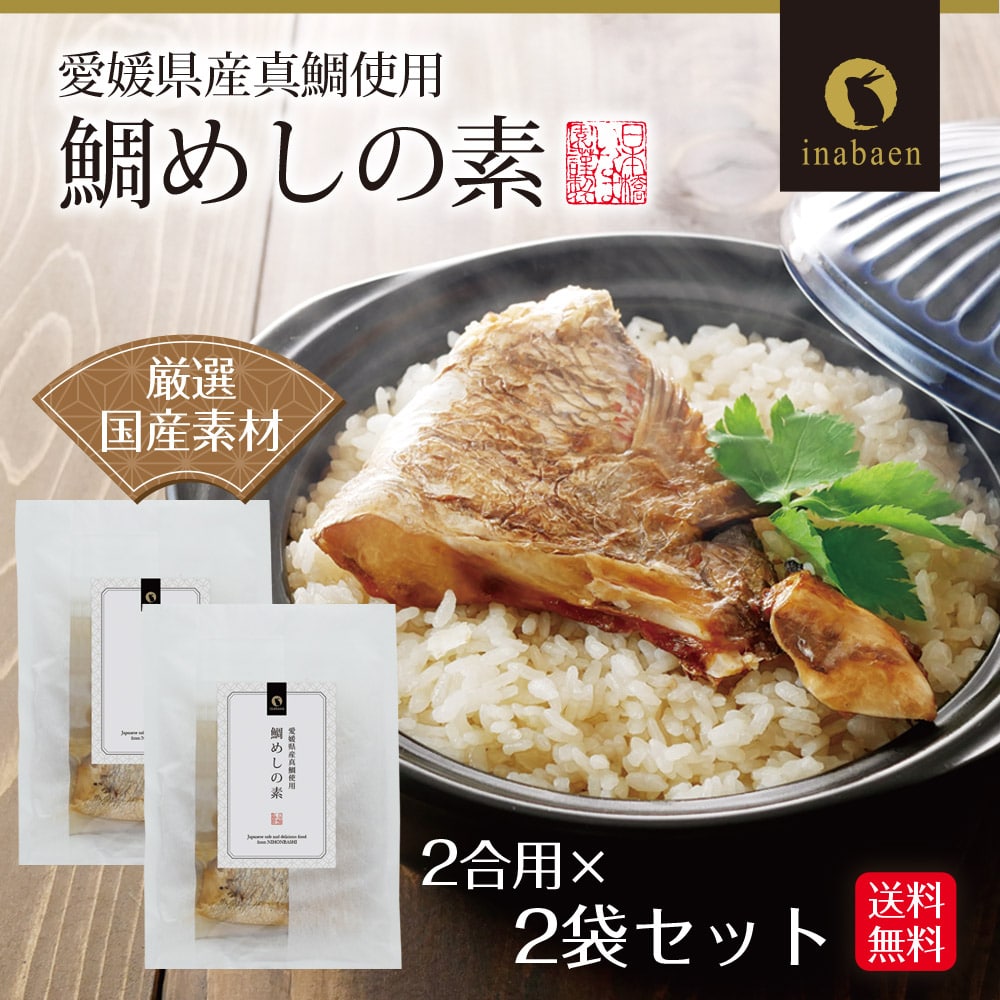 美味しいお召し上がり方(2合炊き) 1、お米二合をとぎ、水を切り、その中に調味液を入れてください。 2、二合の白米を炊く水加減まで水を入れてください。 3、その上に鯛の切り身をそのまま置いて炊き上げてください、(鯛の切り身は焼いています。) 4、炊き上がりましたら鯛の切り身を一度取り出し身をほぐし再度炊き上がったご飯の上に入れ混ぜ合わせれば出来上がりです。 ※鯛の切り身を取り出す時や身をほぐす時にはやけどをしないよう十分ご注意してください。 名称 炊き込みご飯の素(鯛めしの素) 原材料名 鯛切り身:真鯛(愛媛県産) 調味液:清酒、かつお節抽出物、昆布エキス、砂糖、醤油、味醂、食塩、(一部に大豆、小麦を含む) 殺菌方法 気密性容器に密封し、加圧加熱殺菌 内容量 鯛切り身(カマ):44g以上(1切~2切) 調味液:150g 保存方法 直射日光を避けて、常温で保存 販売者 株式会社いなば園 東京都中央区日本橋2-16-13 栄養成分表示(1袋あたり) エネルギー 131kcal たんぱく質 12.3g 脂質 4.9g 炭水化物 9.6g 食塩相当量 7.4g ※推定値 注意事項 鯛の切り身には骨がありますので、十分注意してお召し上がりください。 鯛の切り身は焼いていますので、皮のこげがある場合がございますが、品質には問題ありません。 開封後は必ず使い切ってください。
