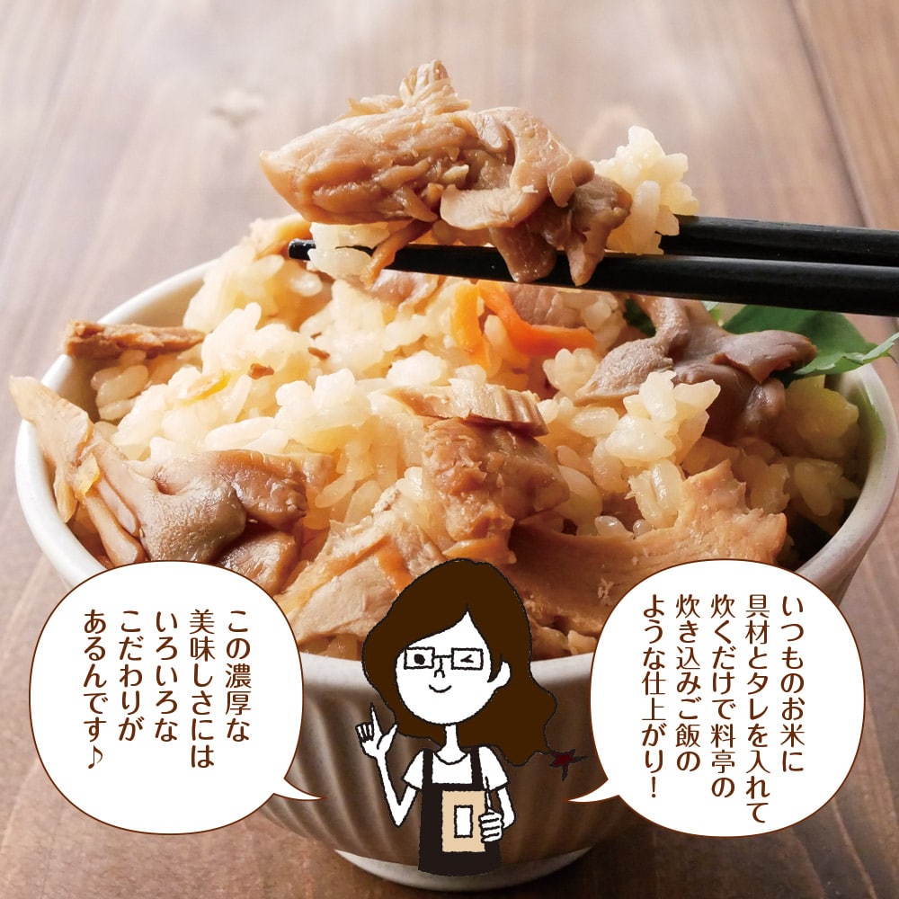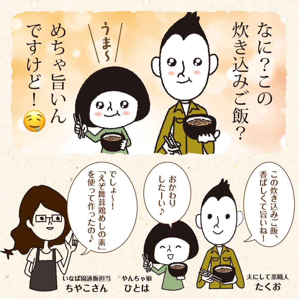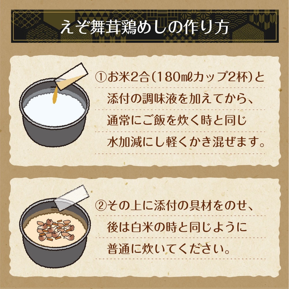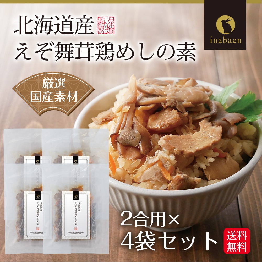 えぞ舞茸鶏めしの素 作り方 1、お米2合(180mlカップ2杯)をご飯を炊く時と同じ水加減に合わせます。 2、その中に調味液と具材と、具材の中の液、お好みで野菜など入れて、具材が崩れない程度によくかき混ぜてから普通に炊いてください。 3、炊き上がりましたら10分ほど蒸らしてください。 ※炊飯器により作り方が異なる場合がありますので炊飯器の説明書を参考にしてください。 ※無洗米をお使いの場合は、芯が残らないように、しばらく水につけてから調理してください。 名称 炊き込みご飯の素 原材料名 [具材]舞茸(北海道産)、鶏肉(北海道産)、醤油、人参、砂糖、発酵調味液、酵母エキス、(一部に小麦・大豆・鶏肉を含む) [調味液]醤油、砂糖、発酵調味液、酵母エキス、(一部に小麦・大豆を含む) 内容量 具材100g(固形量70g)、調味液35g ×4個 保存方法 直射日光、高温多湿を避け常温で保存してください。 調理後は、お早めにお召し上がりください。 販売者 株式会社いなば園 東京都中央区日本橋2-16-13 栄養成分表示(100g当たり) エネルギー 74kcal たんぱく質 5.4g 脂質 1.0g 炭水化物 10.6g 食塩相当量 2.4g ※この表示値は、目安です。
