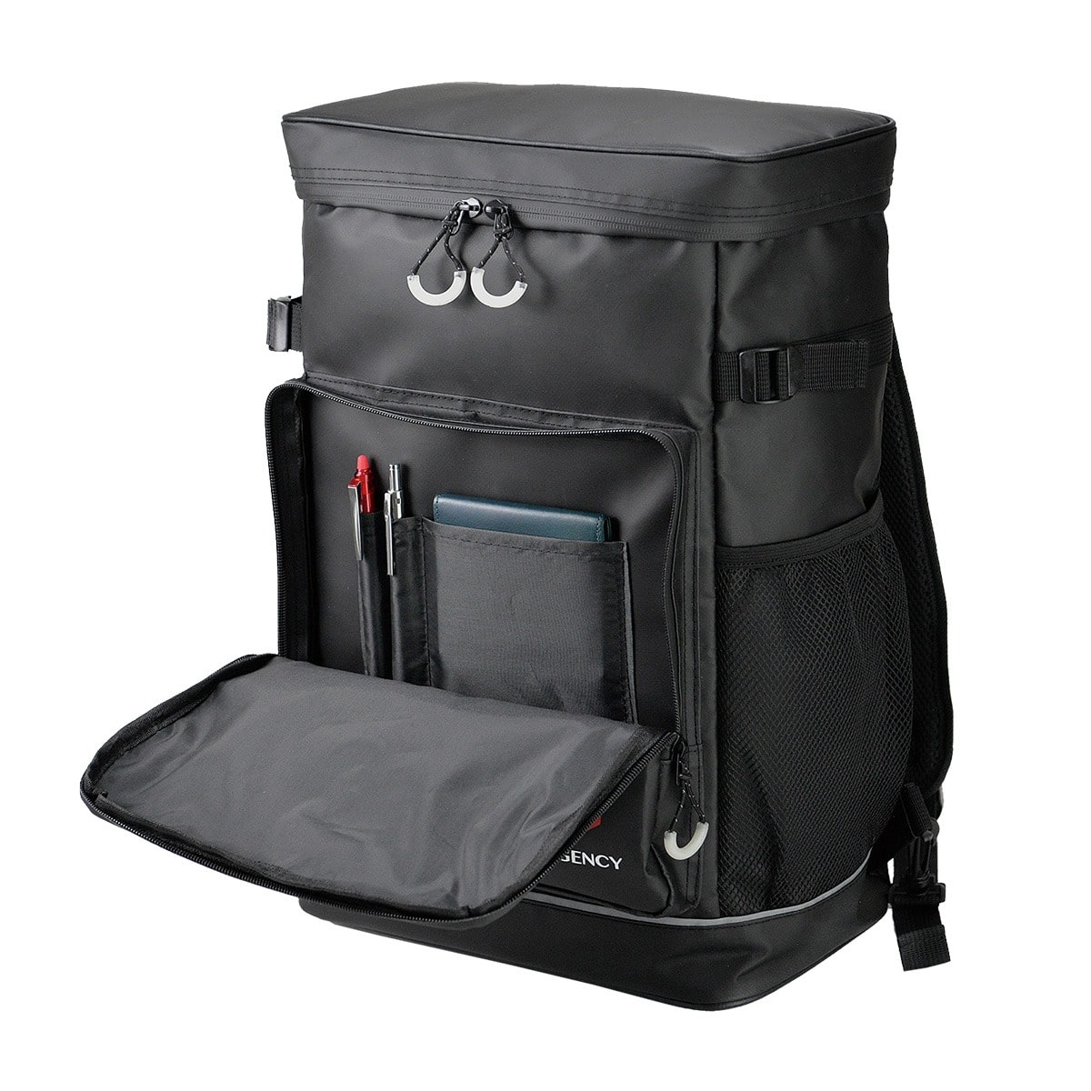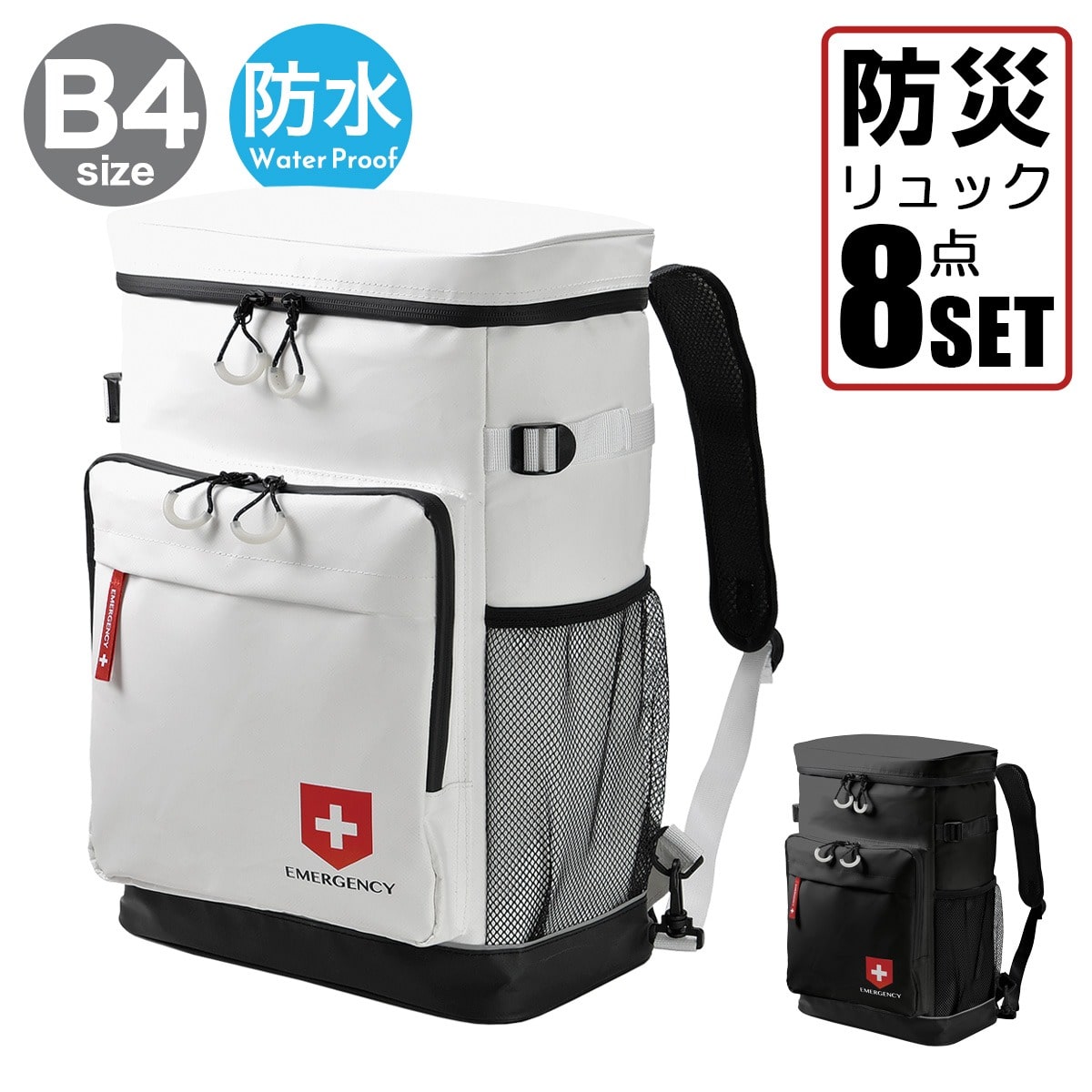 災害に備える、防水・反射材付きの非常持ち出しリュック。8点の防災アイテムがセットになっています。