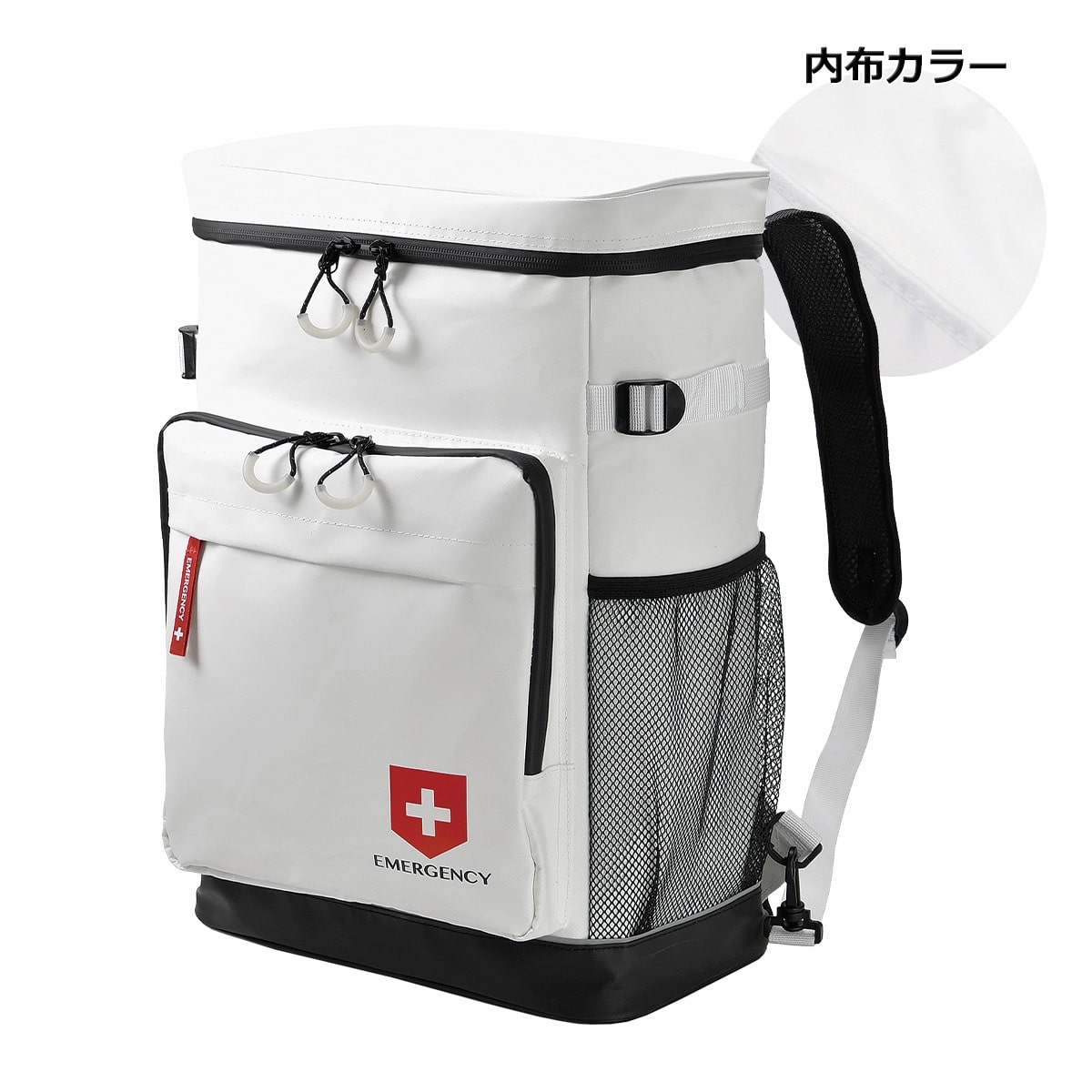 災害に備える、防水・反射材付きの非常持ち出しリュック。8点の防災アイテムがセットになっています。■雨に強い、ターポリン&止水ファスナーターポリンは、ポリエステル生地に合成樹脂をコーティングした素材で、水を通しにくく高い防水性があります。さらに防水コーティングが施された止水ファスナーを使用しています。■夜間も安心、光るジッパータブ&反射材ジッパータブは蓄光素材で太陽光や蛍光灯の光を蓄え、暗闇で自然に発行するため、位置が分かりやすくなります。また、反射材は光を反射し、夜間でも位置を知らせます。■快適設計開口部が大きく開くので荷物の出し入れがスムーズです。内装にはノートPC収納ポケットを装備、仕分け用としても便利です。本体背面とベルトには、クッション性と通気性に優れたエアメッシュを採用。キャリーオン機能も搭載しています。