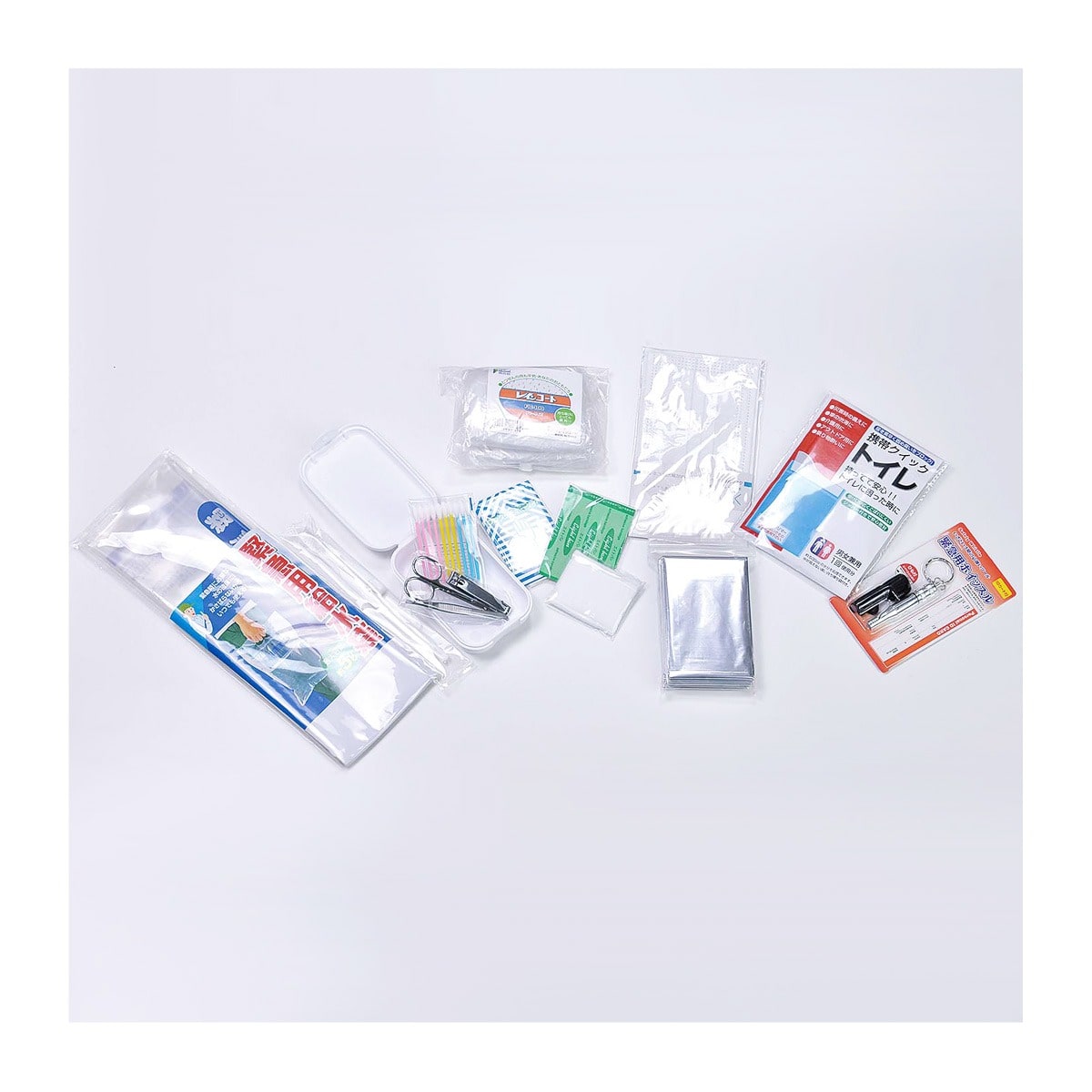 付属:・防寒シート・レインコート・歯ブラシセット・緊急用給水袋・携帯トイレ・マスク・緊急用ホイッスル・応急処置キット(爪切り、やすり、ピンセット、はさみ、絆創膏、ガーゼ、ホータイ、綿棒)