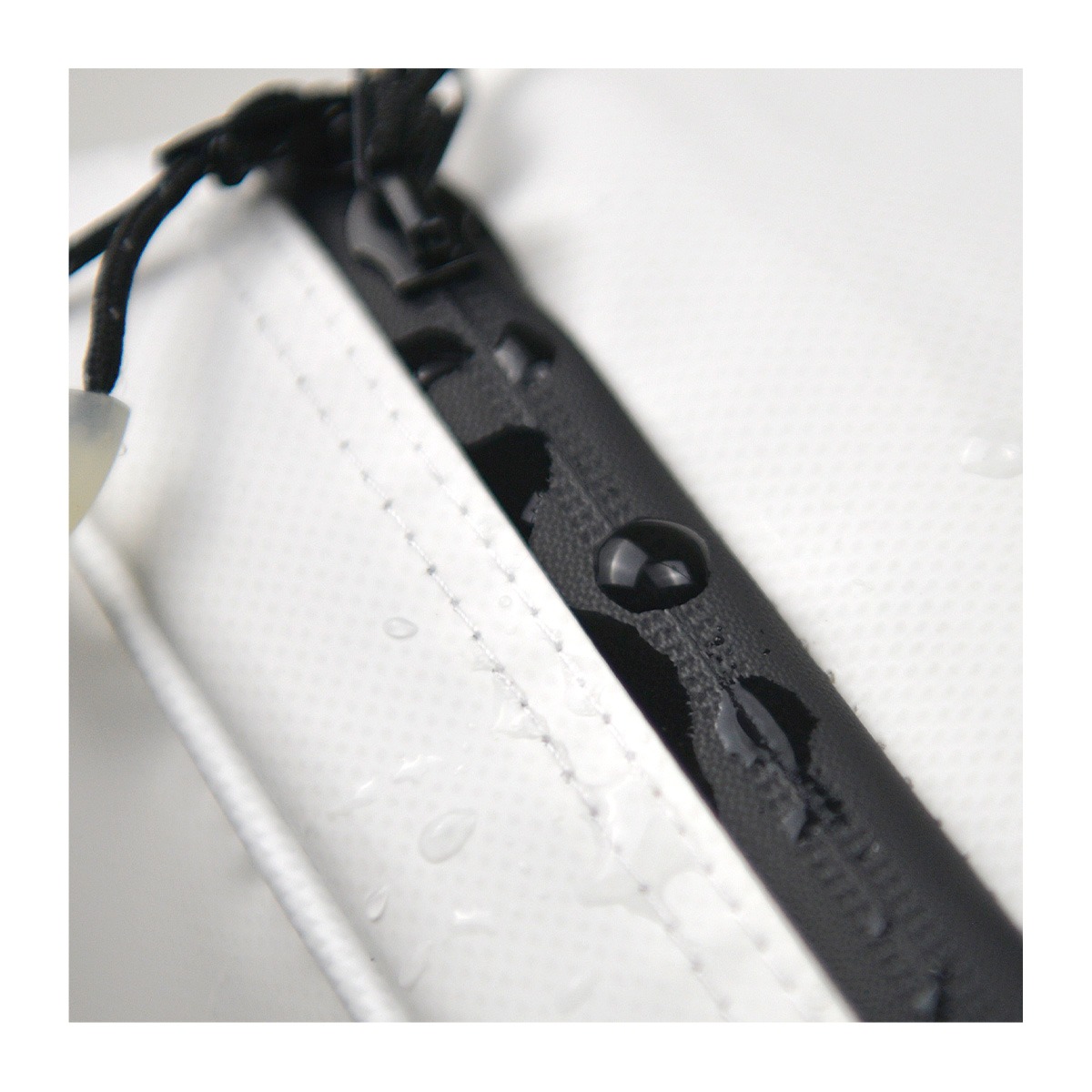 ターポリンは、ポリエステル生地に合成樹脂をコーティングした素材で、水を通しにくく高い防水性があります。さらに防水コーティングが施された止水ファスナーを使用しています。