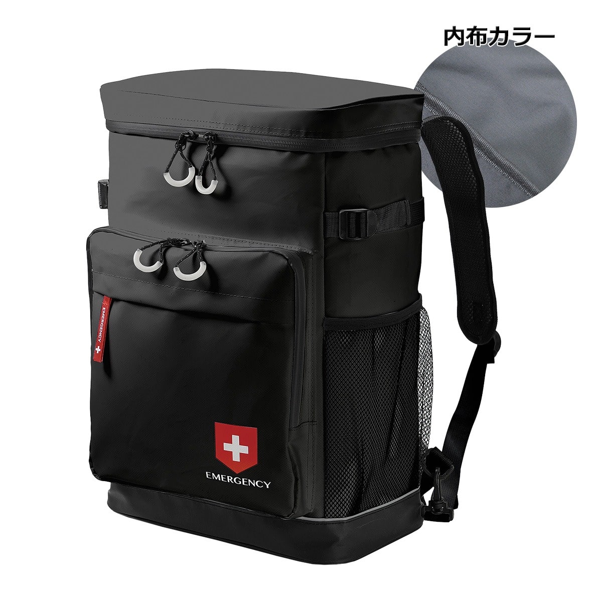 災害に備える、防水・反射材付きの非常持ち出しリュック。8点の防災アイテムがセットになっています。■雨に強い、ターポリン&止水ファスナーターポリンは、ポリエステル生地に合成樹脂をコーティングした素材で、水を通しにくく高い防水性があります。さらに防水コーティングが施された止水ファスナーを使用しています。■夜間も安心、光るジッパータブ&反射材ジッパータブは蓄光素材で太陽光や蛍光灯の光を蓄え、暗闇で自然に発行するため、位置が分かりやすくなります。また、反射材は光を反射し、夜間でも位置を知らせます。■快適設計開口部が大きく開くので荷物の出し入れがスムーズです。内装にはノートPC収納ポケットを装備、仕分け用としても便利です。本体背面とベルトには、クッション性と通気性に優れたエアメッシュを採用。キャリーオン機能も搭載しています。
