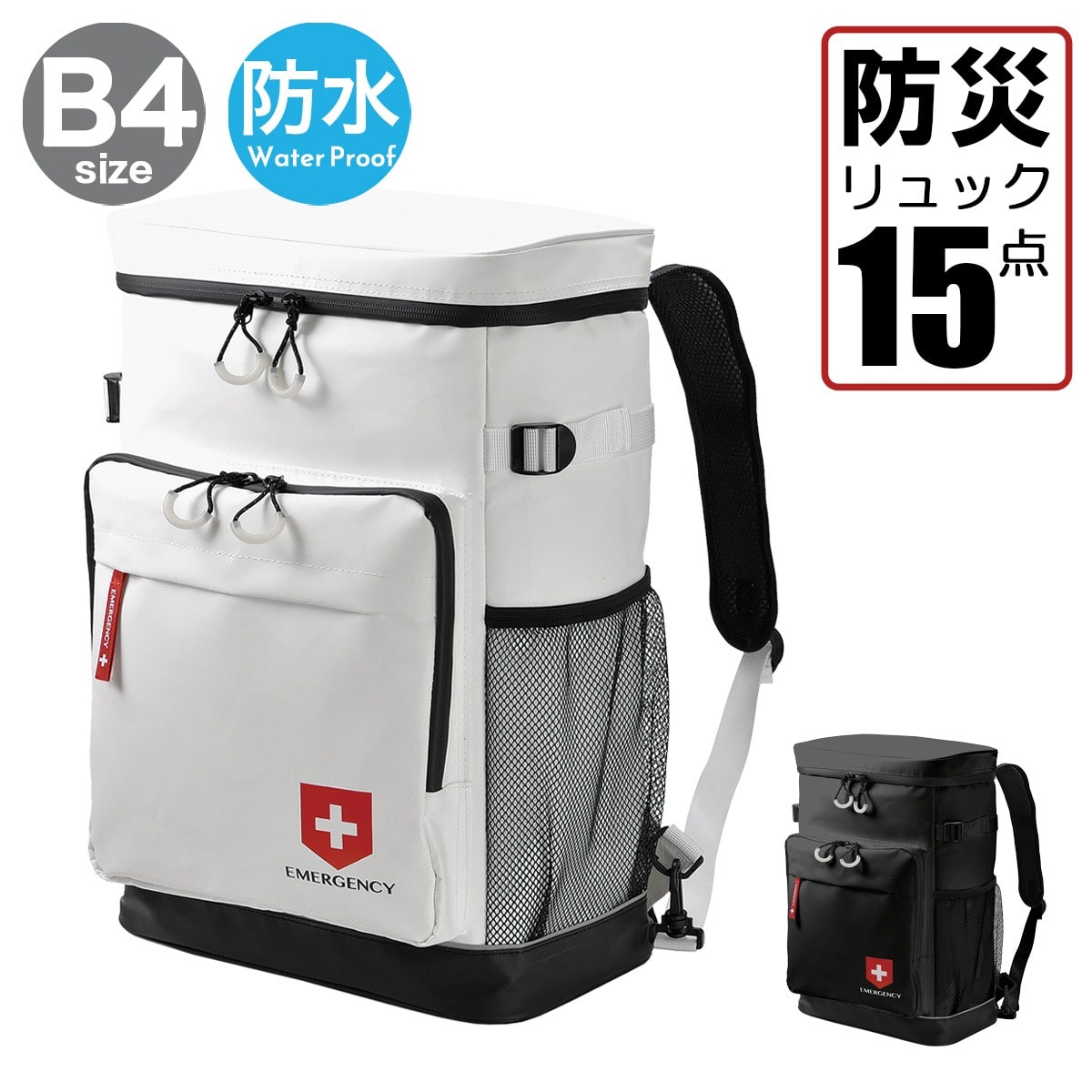災害に備える、防水・反射材付きの非常持ち出しリュック。15点の防災アイテムがセットになっています。