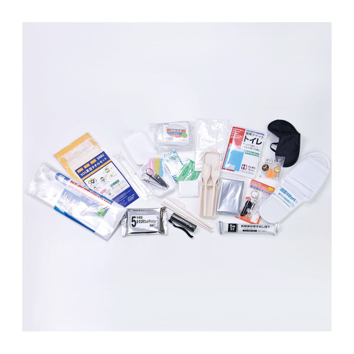 付属:・防寒シート・レインコート・歯ブラシセット・緊急用給水袋・携帯トイレ・マスク・緊急用ホイッスル・応急処置キット(爪切り、やすり、ピンセット、はさみ、絆創膏、ガーゼ、ホータイ、綿棒)※以下は15点セットのみに付属・スリッパ・防災用ウェットティッシュ・大判厚手おしぼり・LEDライト・カトラリーセット(スプーン、フォーク、ナイフ、箸)・安眠セット(耳栓、アイマスク)・真空タオルセット(タオル、軍手、マスク)