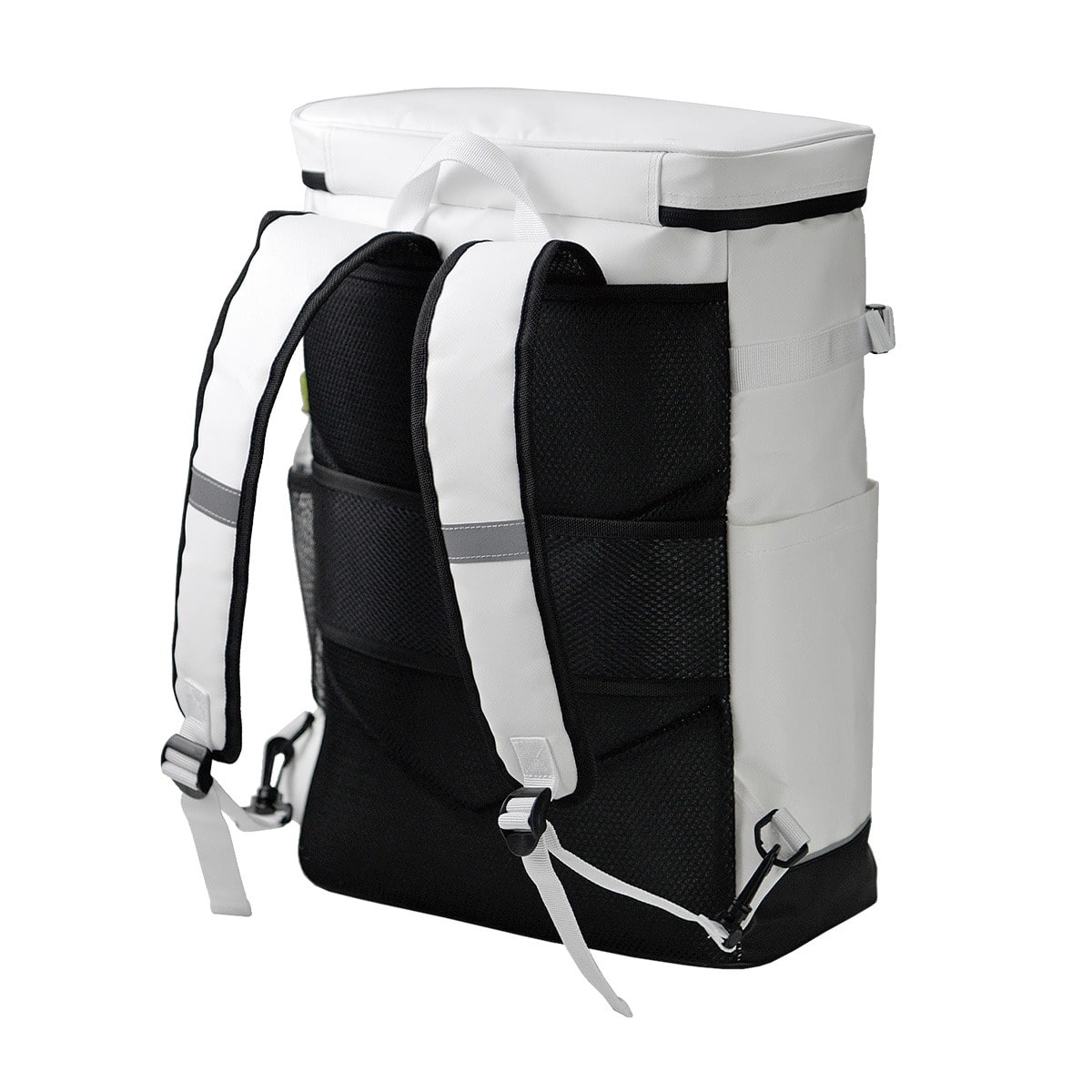 ターポリンは、ポリエステル生地に合成樹脂をコーティングした素材で、水を通しにくく高い防水性があります。さらに防水コーティングが施された止水ファスナーを使用しています。