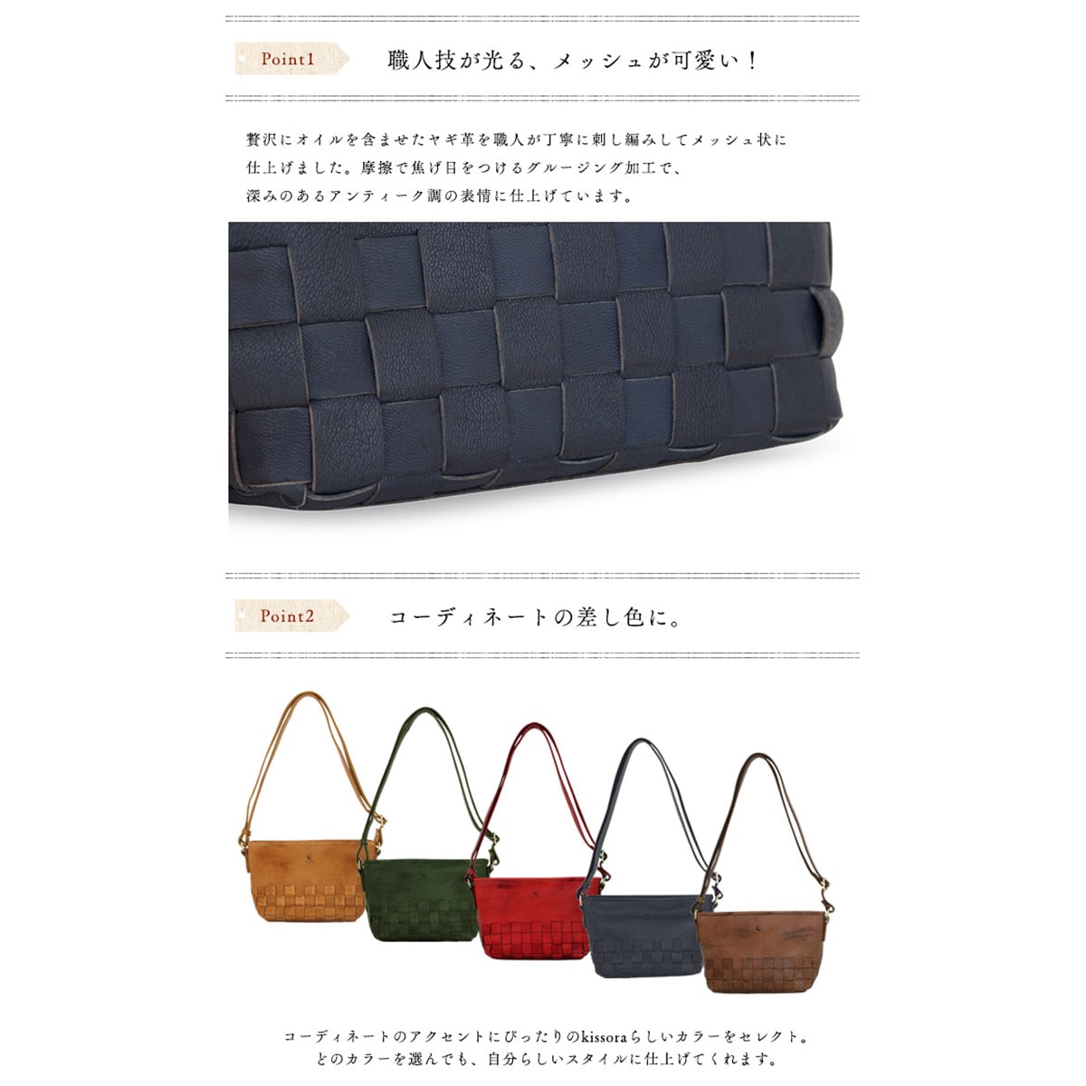 贅沢にオイルを含ませたヤギ革を職人が丁寧に刺し編みしてメッシュ状に仕上げ、完成したバッグにロウを塗って強い圧力と熱を加えながら摩擦で焦げ目をつけるグルージング加工で、深みのあるアンティーク調の表情に仕上げています。