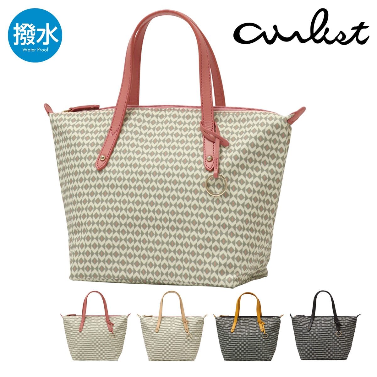 リボンリボンをモチーフにしたジオメトリック柄の トートバッグ & ポーチ。軽量で機能的なナイロンを主素材にしっかりとした革とのコンビネーション。ロゴの入ったリングチャーム等で、オン&オフどちらもつかえる大人の女性に向けたバッグです。メイン素材の国産ナイロンはインクジェットプリントのあと撥水加工を施しました。