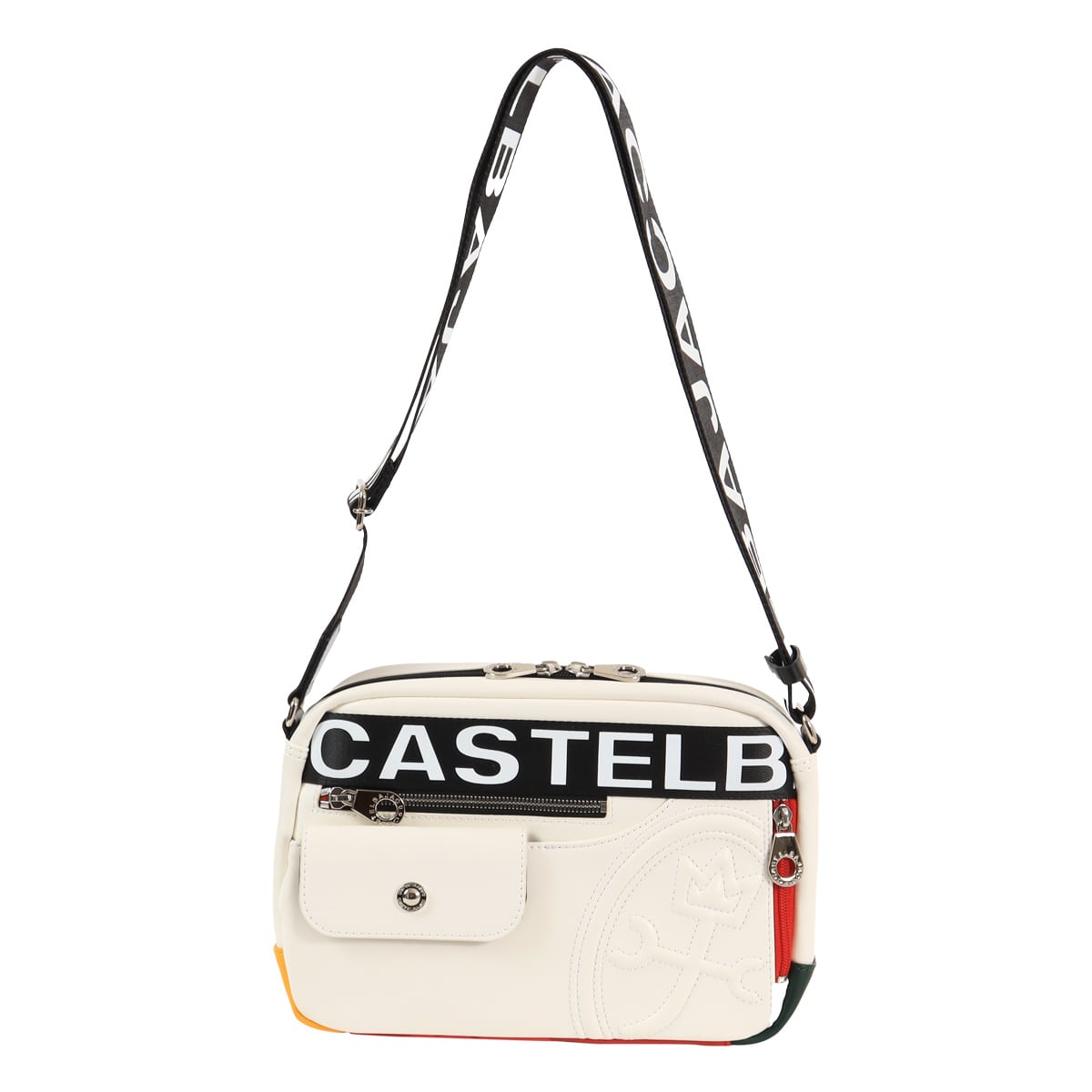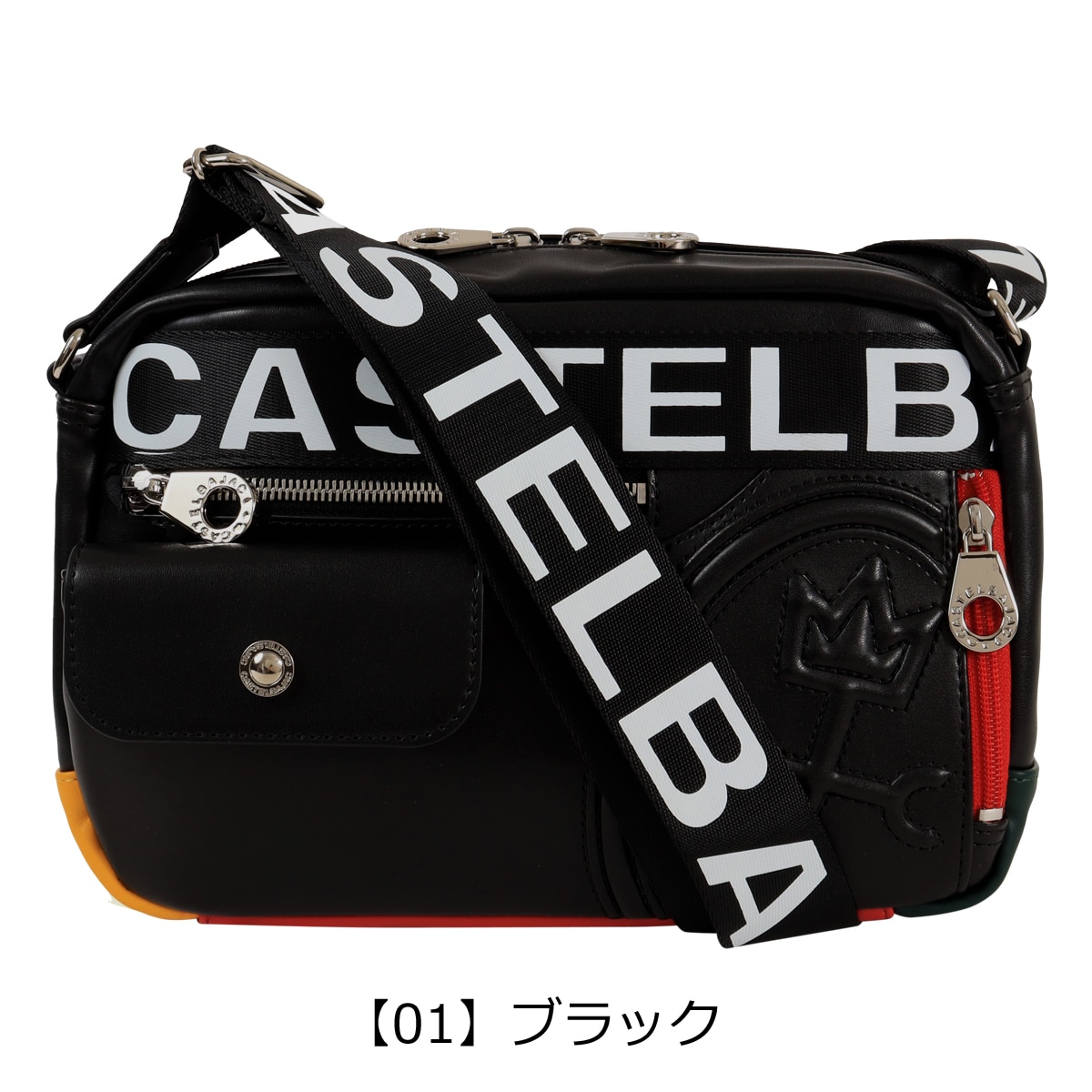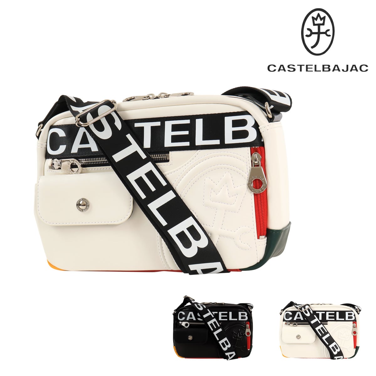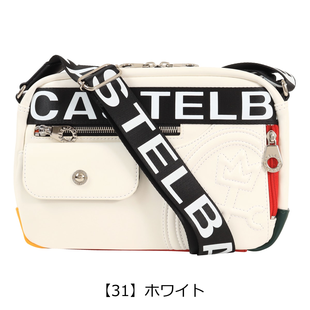 大きな盛り上げブランド家紋が目を引く、カステルバジャックのヨコ型ショルダーバッグ。赤色のファスナーや、底面のアカ・グリーン・イエローの鮮やかなブランドカラーがアクセントとなっており、バッグ全体が一層際立つデザインとなっています。