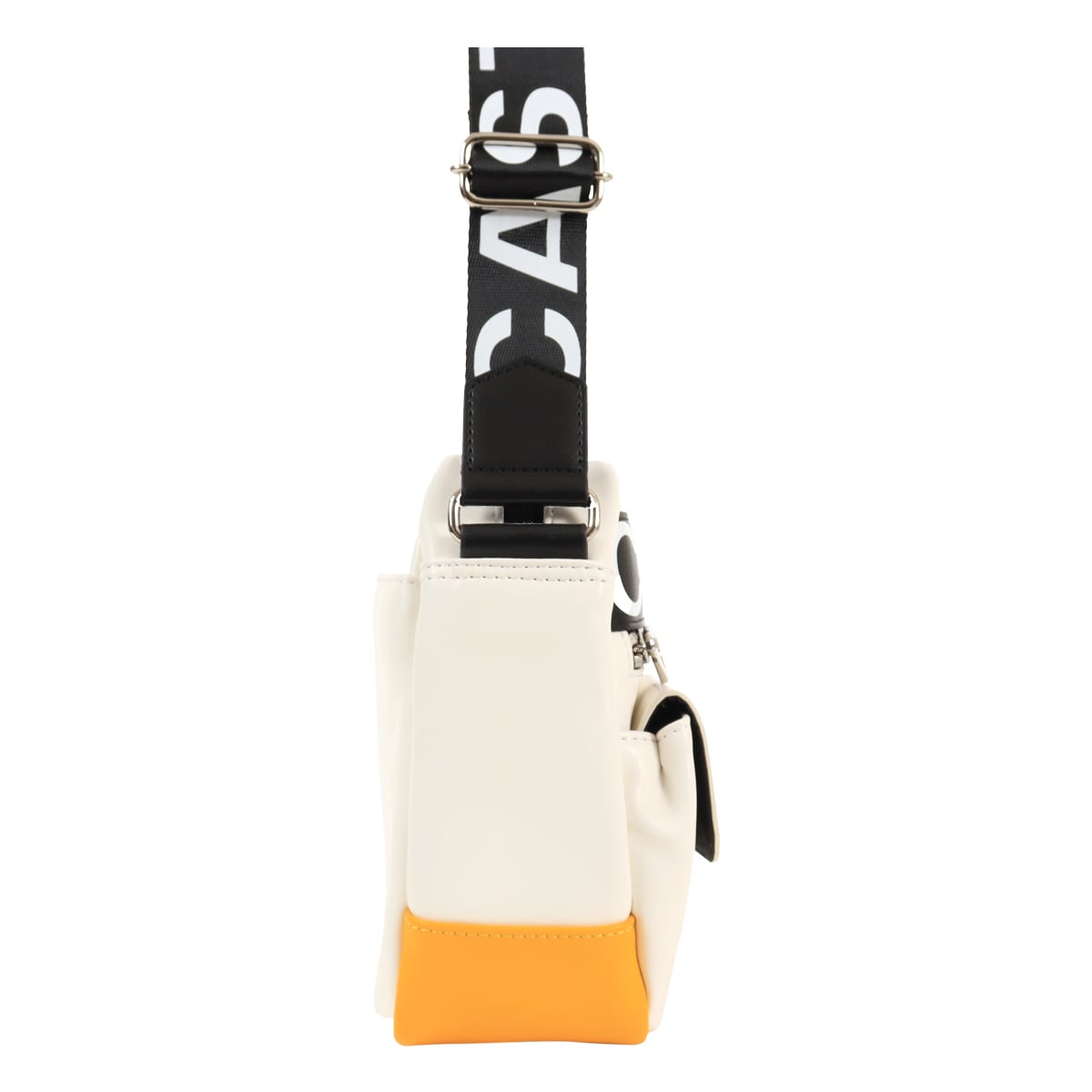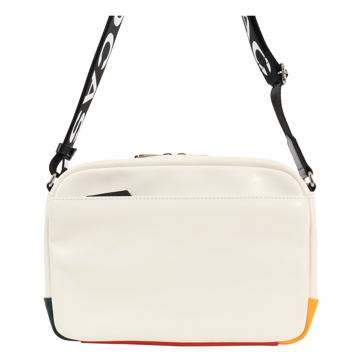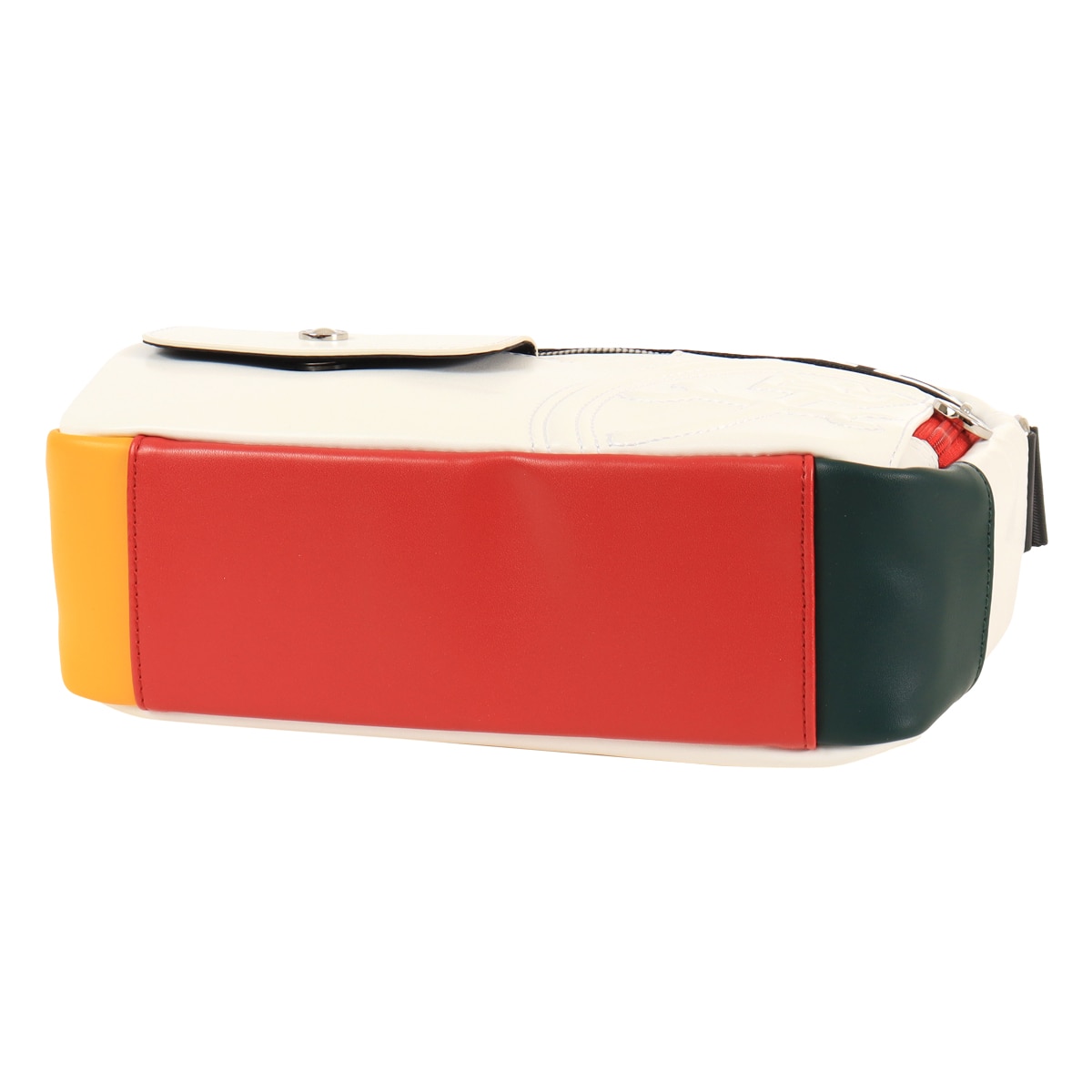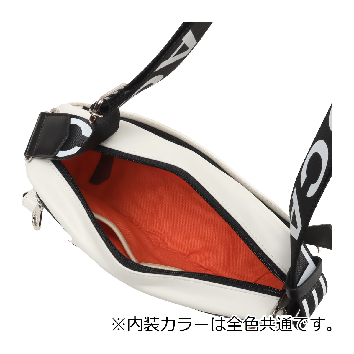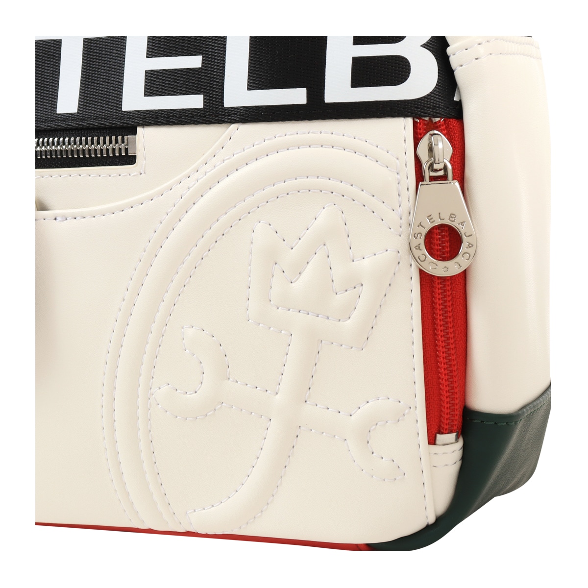 大きな盛り上げブランド家紋が目を引く、カステルバジャックのヨコ型ショルダーバッグ。赤色のファスナーや、底面のアカ・グリーン・イエローの鮮やかなブランドカラーがアクセントとなっており、バッグ全体が一層際立つデザインとなっています。