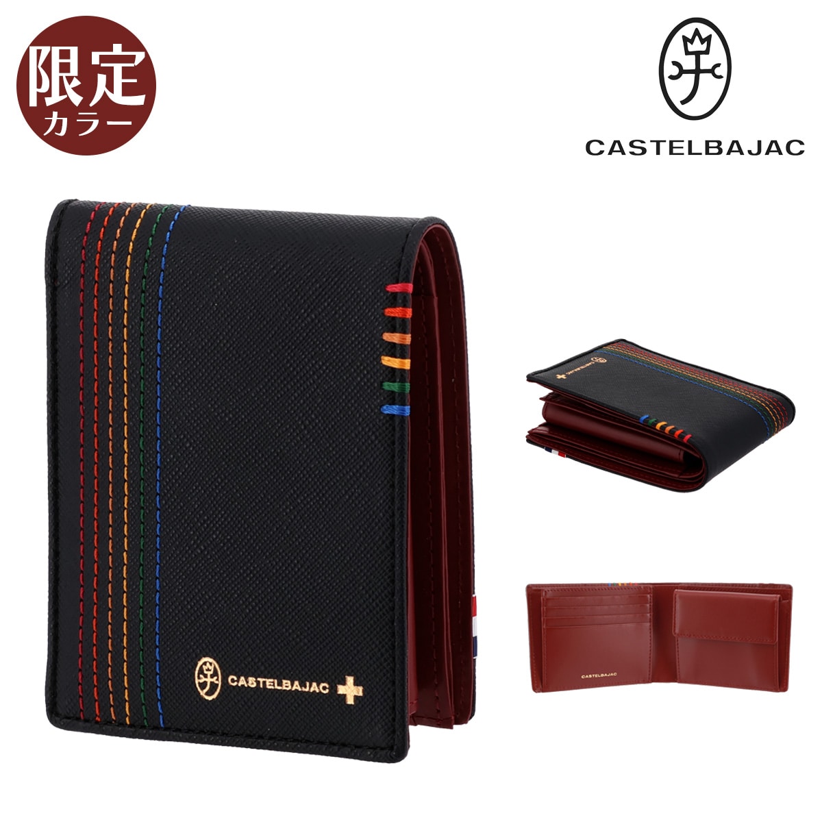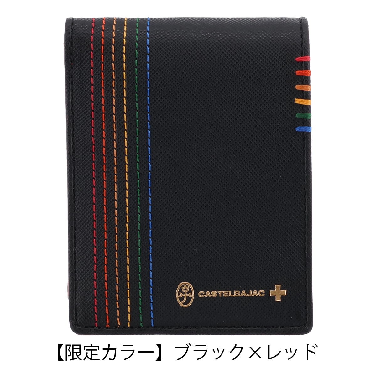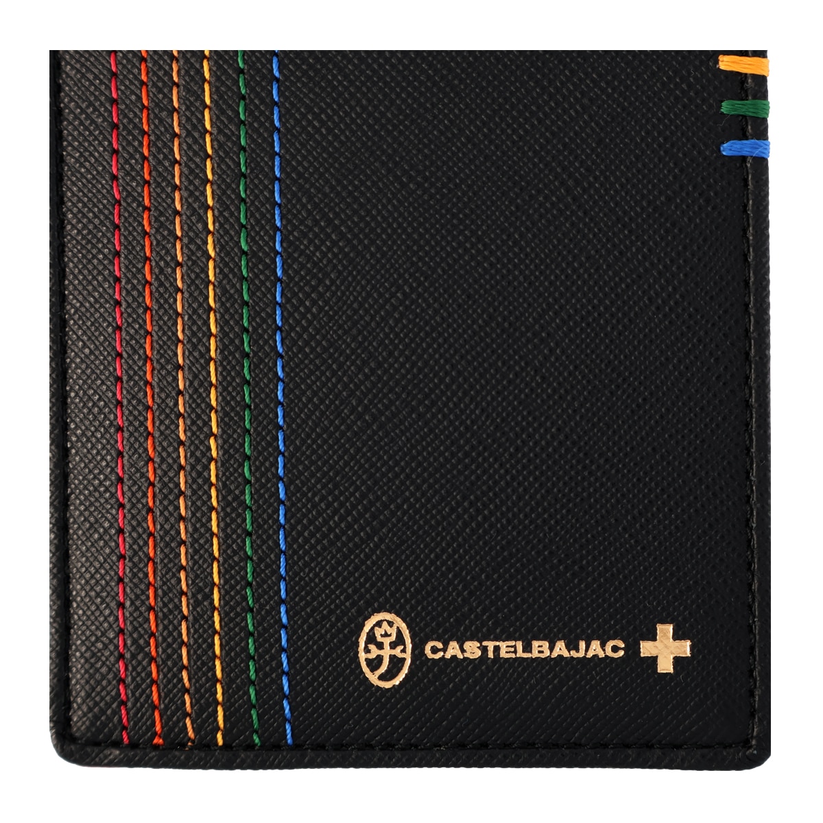 カステルバジャックで使用される6色のイメージカラーを飾りステッチと手かがりステッチで表現した「シェスト小物」シリーズ。光沢のあるゴールド色ファスナー、金具そしてネーム表現と、小銭入れの裏地にもゴールド色のサテン生地を使用し、ユニセックスな感覚に仕上がっています。