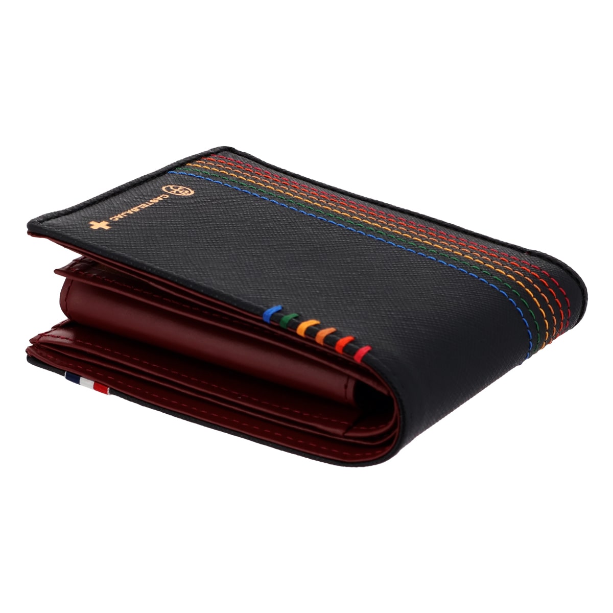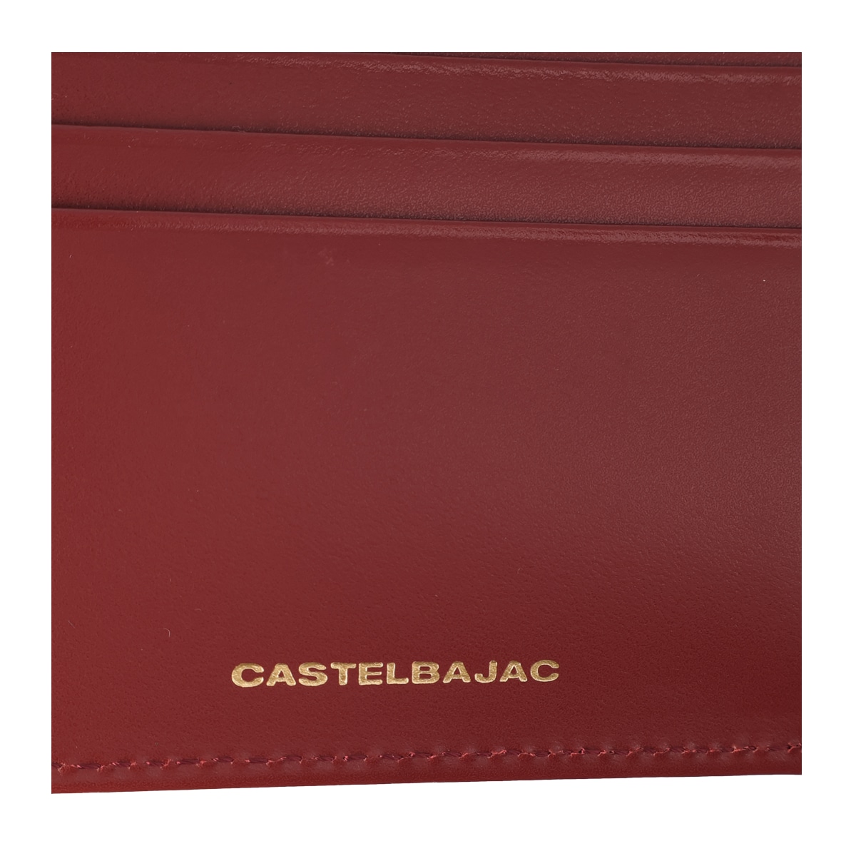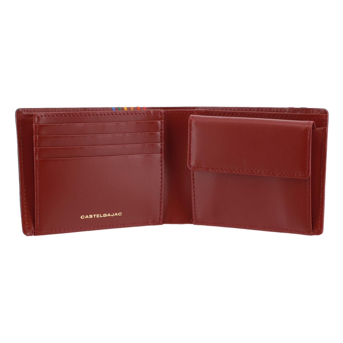 カステルバジャックで使用される6色のイメージカラーを飾りステッチと手かがりステッチで表現した「シェスト小物」シリーズ。光沢のあるゴールド色ファスナー、金具そしてネーム表現と、小銭入れの裏地にもゴールド色のサテン生地を使用し、ユニセックスな感覚に仕上がっています。
