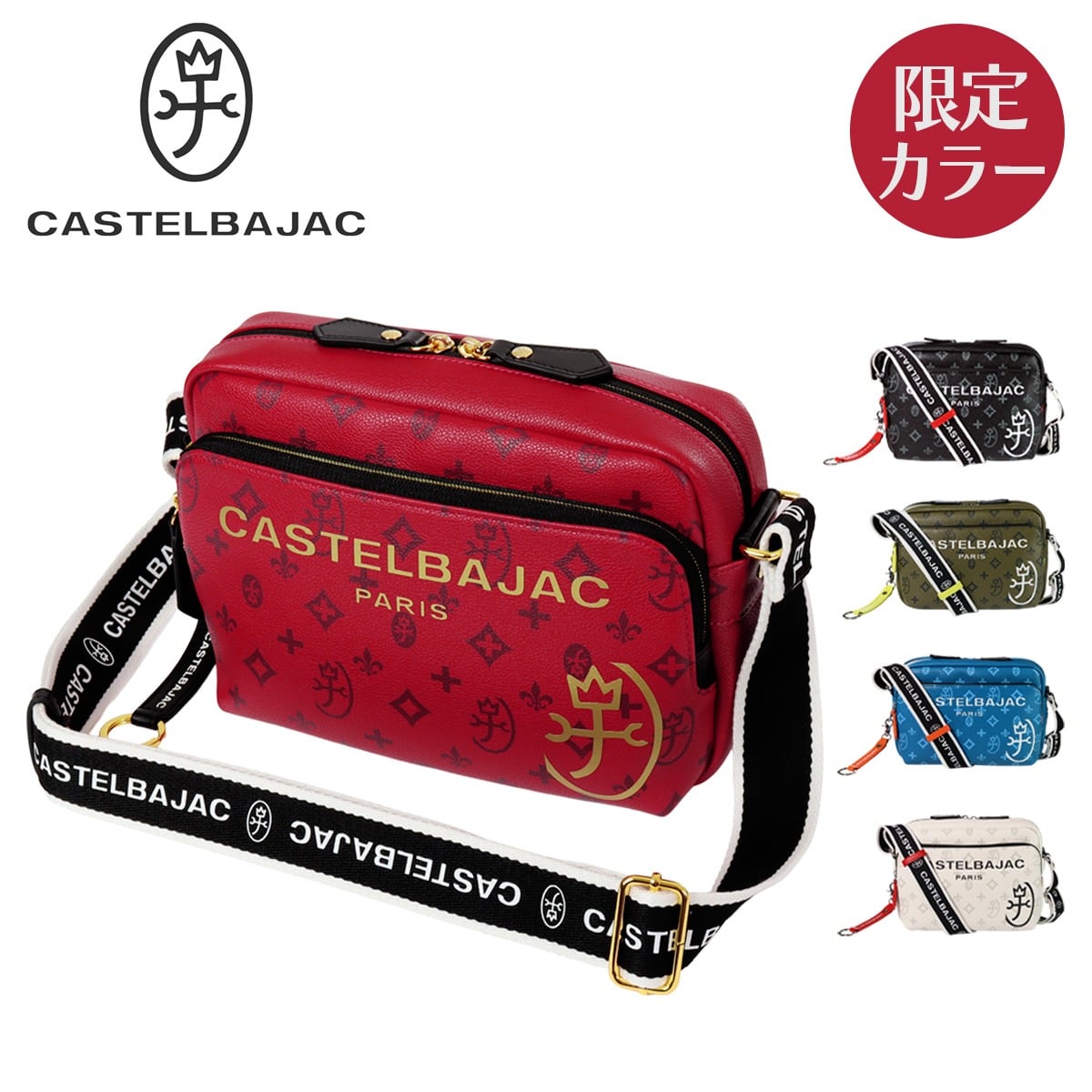 バッグの本体色と差し色にもなるアクセントカラーのコンビネーションが魅力のカステルバジャックのミニショルダーバッグ。本体素材はシボ感のある合成皮革を使用し、カバンの前面や背面にカステルバジャックのオリジナルモノグラム柄をプリントしました。付属のストラップがアクセントとなっています。