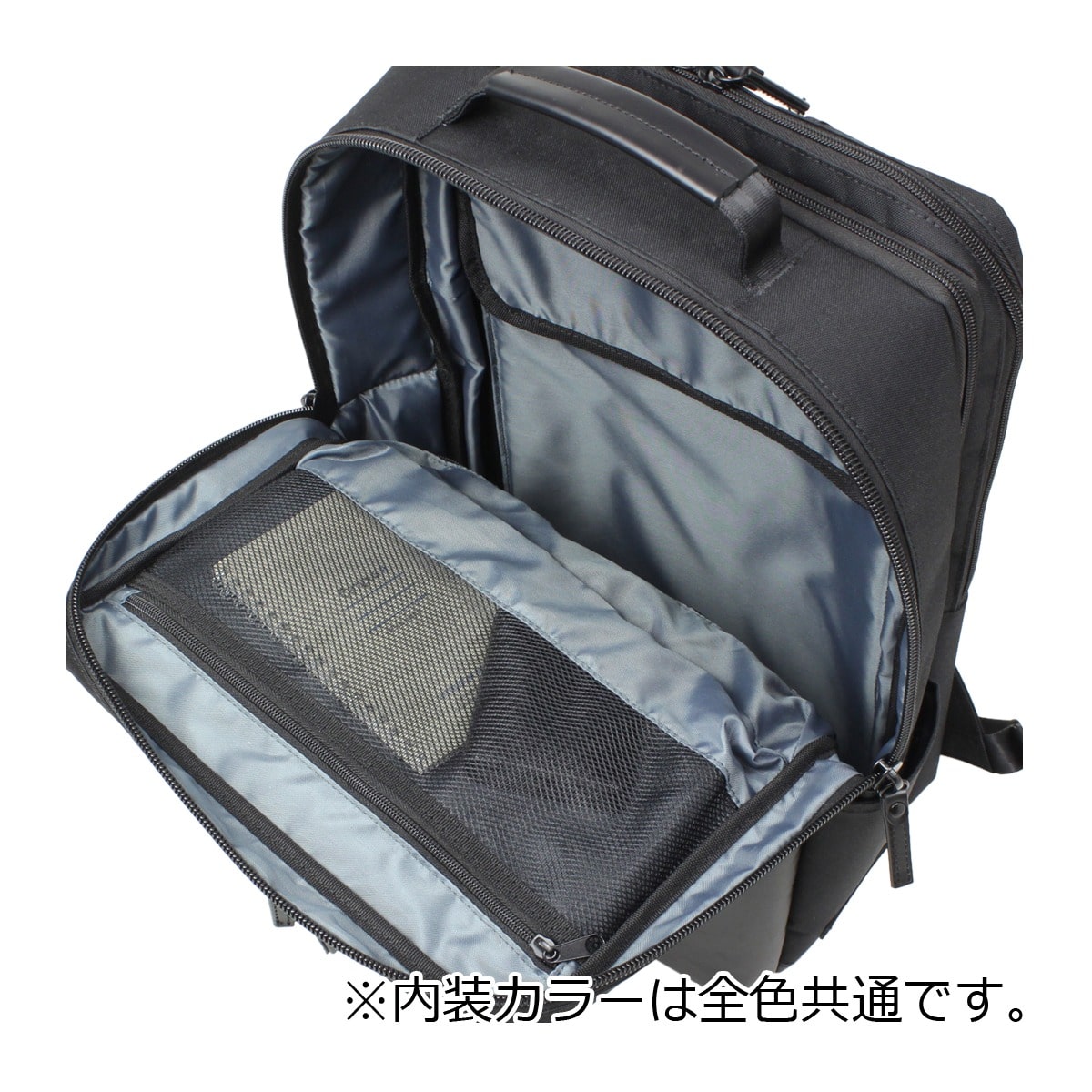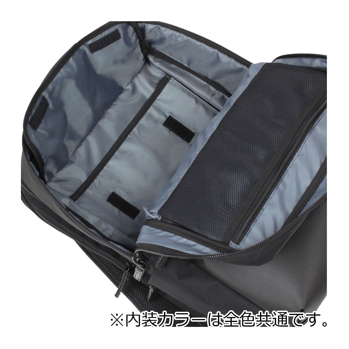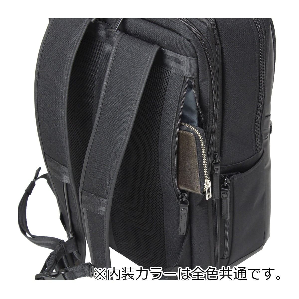 仕様:ダブルファスナー式開閉内側:前面側:ファスナー式メッシュポケット×2フラップポケット×1背面側:PC収納ポケット×1前面:ダブルファスナーポケット×1(内側:マチ付きフリーポケット×1、ペンホルダー×1、フリーポケット×1)ファスナーポケット×1背面:ファスナーポケット×1側面:フリーポケット×1ファスナー拡張ポケット×1エキスパンダブル機能チェストベルト