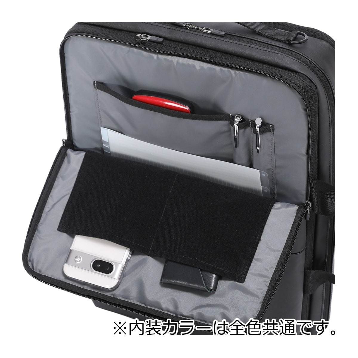 仕様:ファスナー式開閉内側:前面側:メッシュポケット×2ファスナーポケット×1メッシュファスナーポケット×1衣類ポケット×1背面側:クッション材入りPC収納ルーム前面:ファスナーポケット×2フリーポケット×3ペンホルダー×2背面:キャリーオンスリーブ、チェストベルト側面:サイドハンドルエキスパンダブル機能、キャリーセットアップ