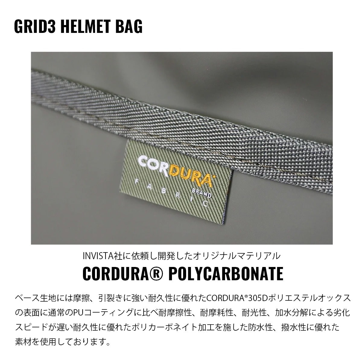 USで使用されていたヘルメットや酸素マスクを持ち運ぶ為のバッグをモチーフにしたGRID3 HELMET BAG はメインZIPがラウンドしたL字開口となり、従来のヘルメットバッグと比べて開口が広く視認性が高くなっております。L字開口部はZIPトリプルスライダーとなっており、サイド部のみの開口も可能です。またヘルメットバッグでは珍しい奥行きを持たせており利便性を高めています。