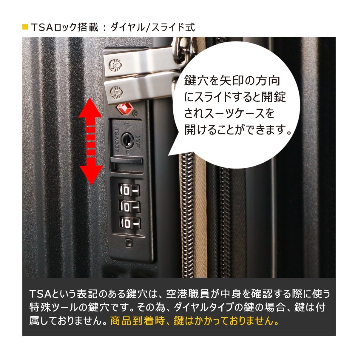 TSAロック:アメリカ(ハワイ等含む)渡航の際、TSA公認の製品に限り鍵をかけて預ける事ができます。この製品のTSAロックは米国連邦航空省運輸保安局が認定しTRAVELSENTRY社が管理・運営しているシステムです。