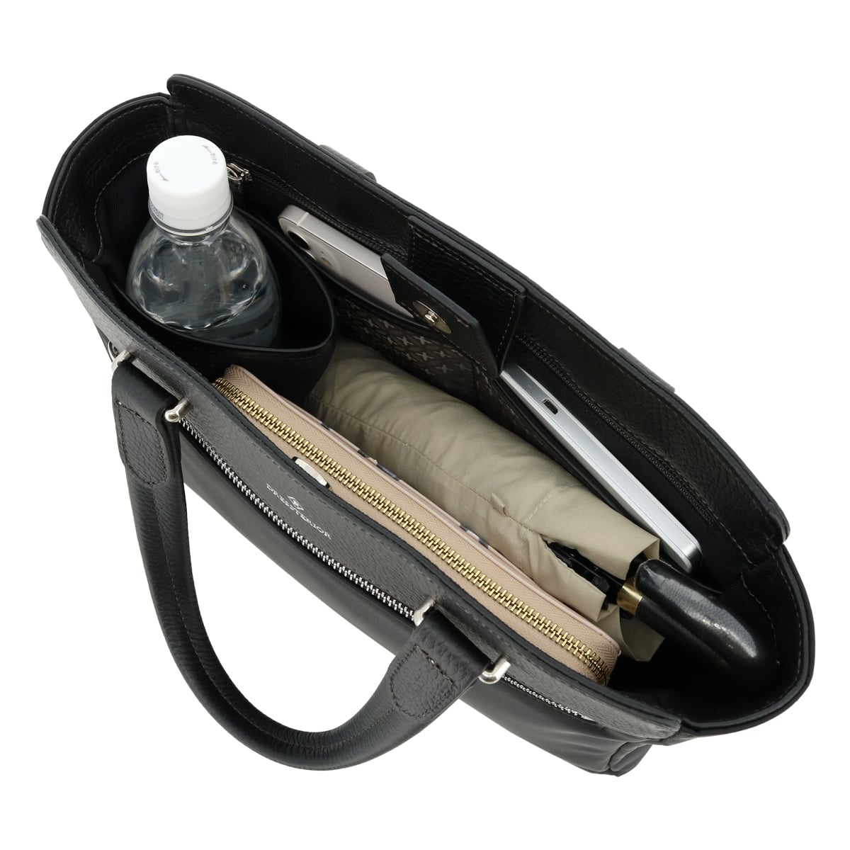 仕様:マグネットボタン式開閉内側:スナップボタンポケット×1ファスナーポケット×1フリーポケット×2ボトルホルダー×1前面:ファスナーポケット×1(内側:フリーポケット×1)背面:マグネットボタンポケット×1