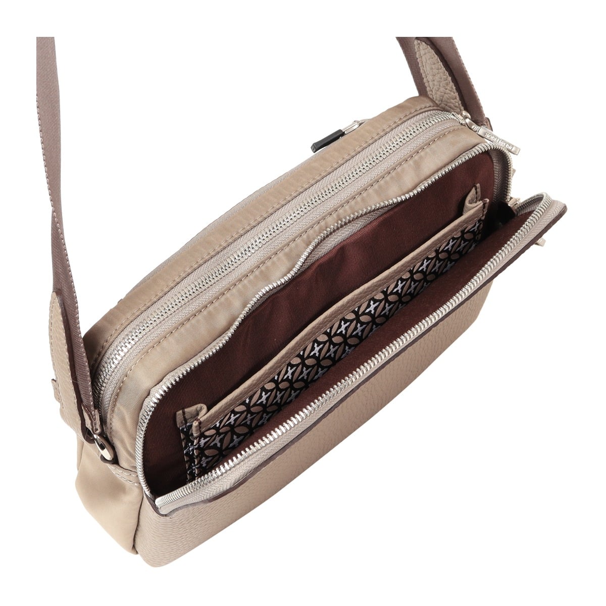 仕様:ダブルファスナー式開閉内側:ファスナーポケット×1前面:ファスナーポケット×1(内側:マチ付きフリーポケット×1)背面:ファスナーポケット×1