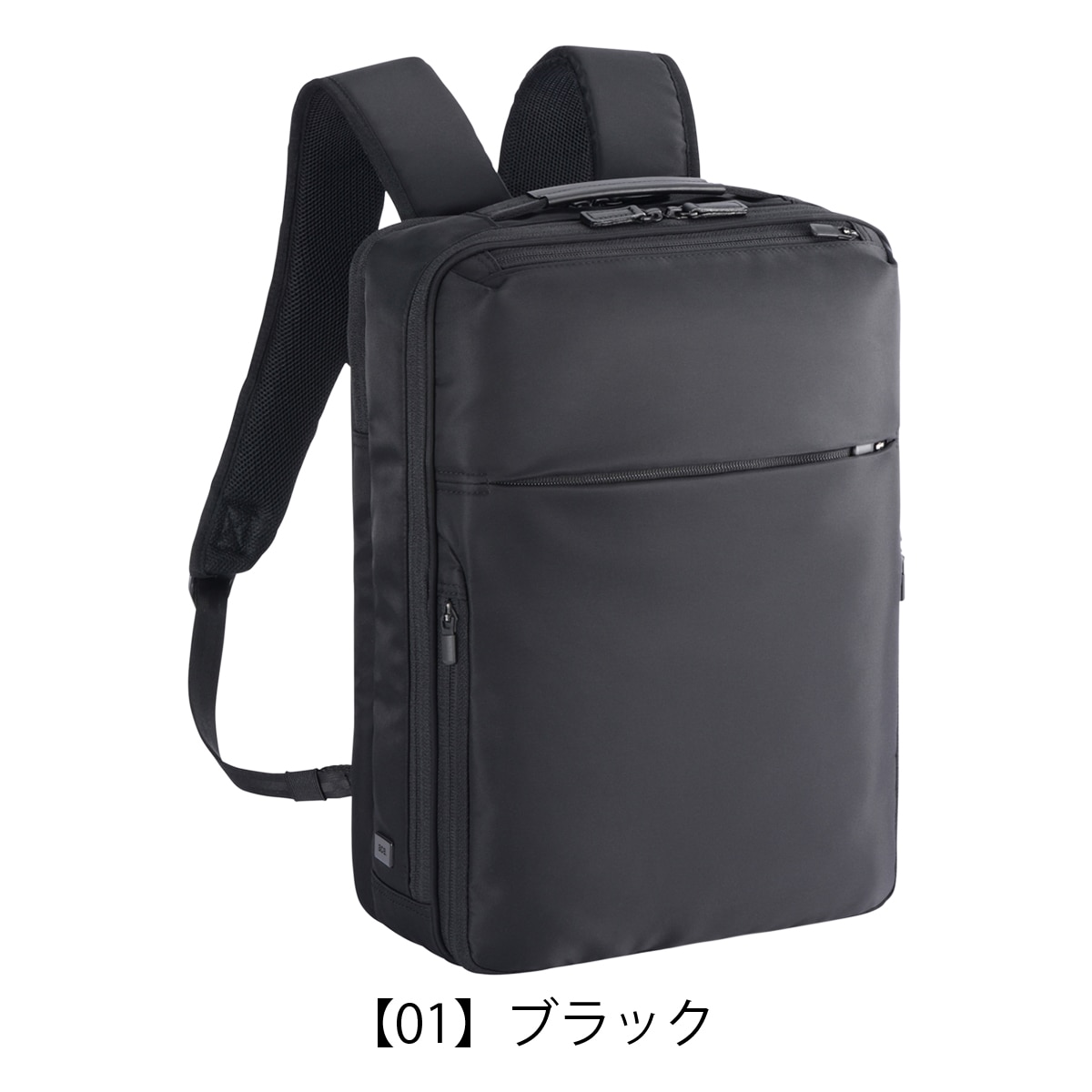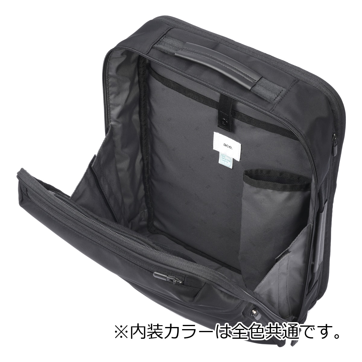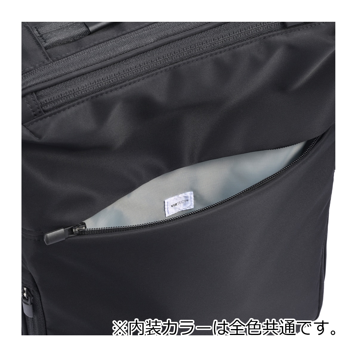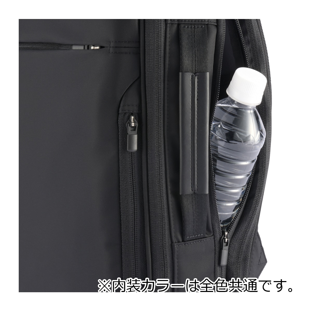 仕様:ダブルファスナー式開閉内側:ファスナーポケット×1メッシュポケット×2ペンホルダー×2ボトルホルダー×1スナップボタンポケット×1前面:ファスナーポケット×3(抗菌・抗ウイルス)背面:L字ファスナーポケット×1(内側:ベルクロ式PC収納ポケット×1)キャリーセットアップ