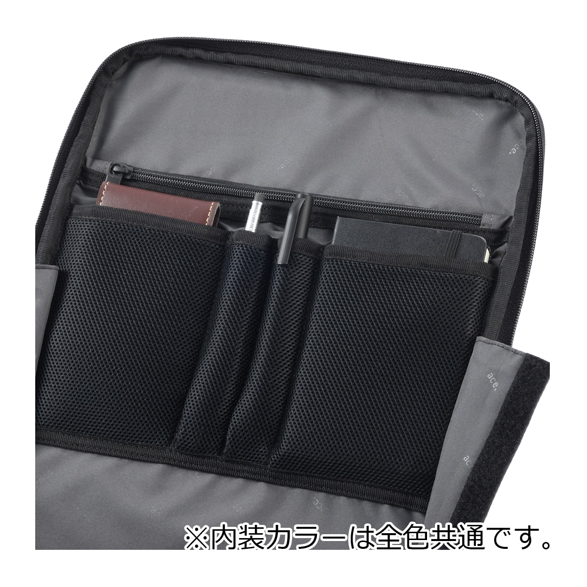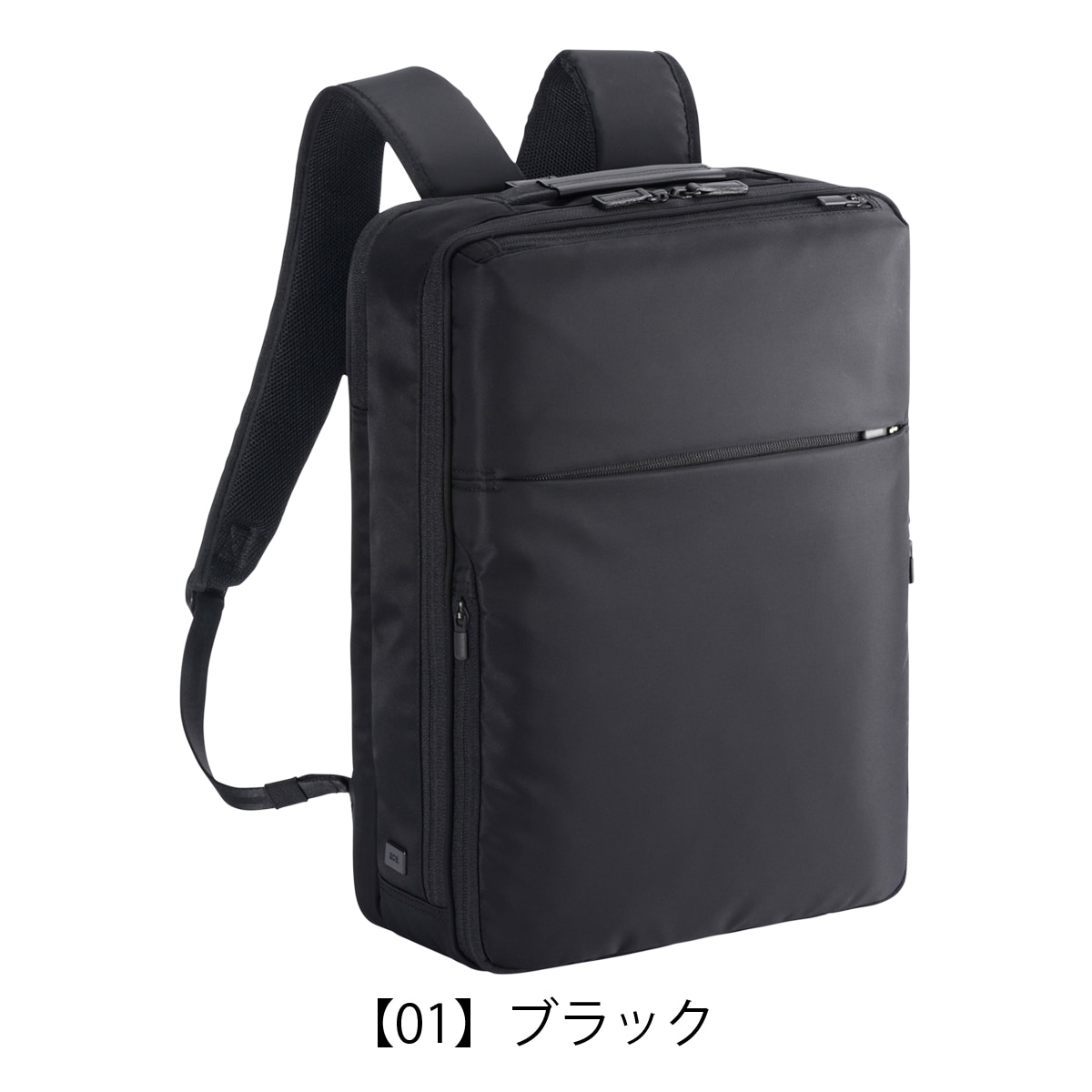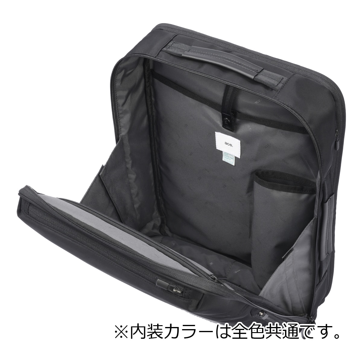 仕様:ダブルファスナー式開閉内側:ファスナーポケット×1メッシュポケット×2ペンホルダー×2ボトルホルダー×1スナップボタンポケット×1前面:ファスナーポケット×3(抗菌・抗ウイルス)背面:L字ファスナーポケット×1(内側:ベルクロ式PC収納ポケット×1)キャリーセットアップ