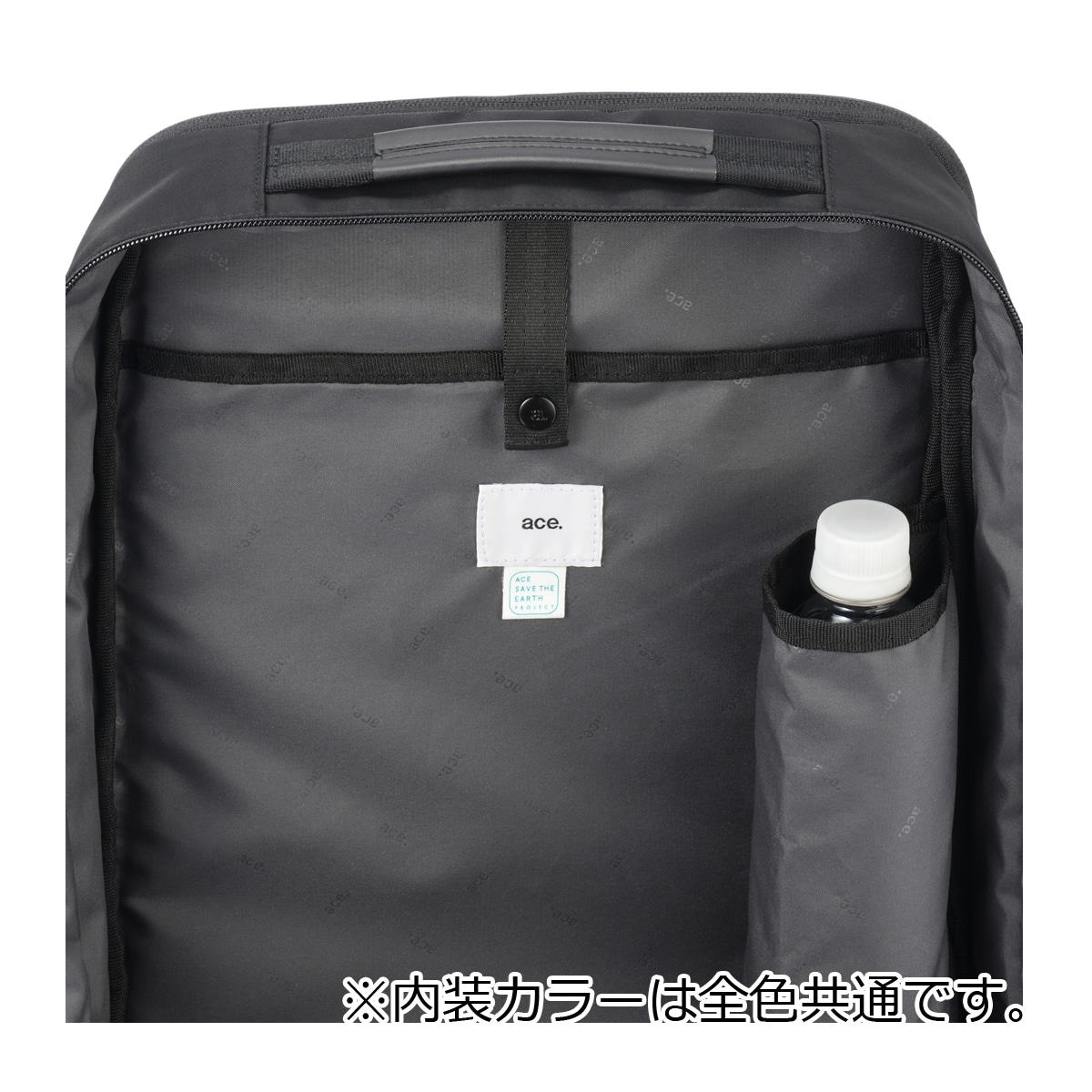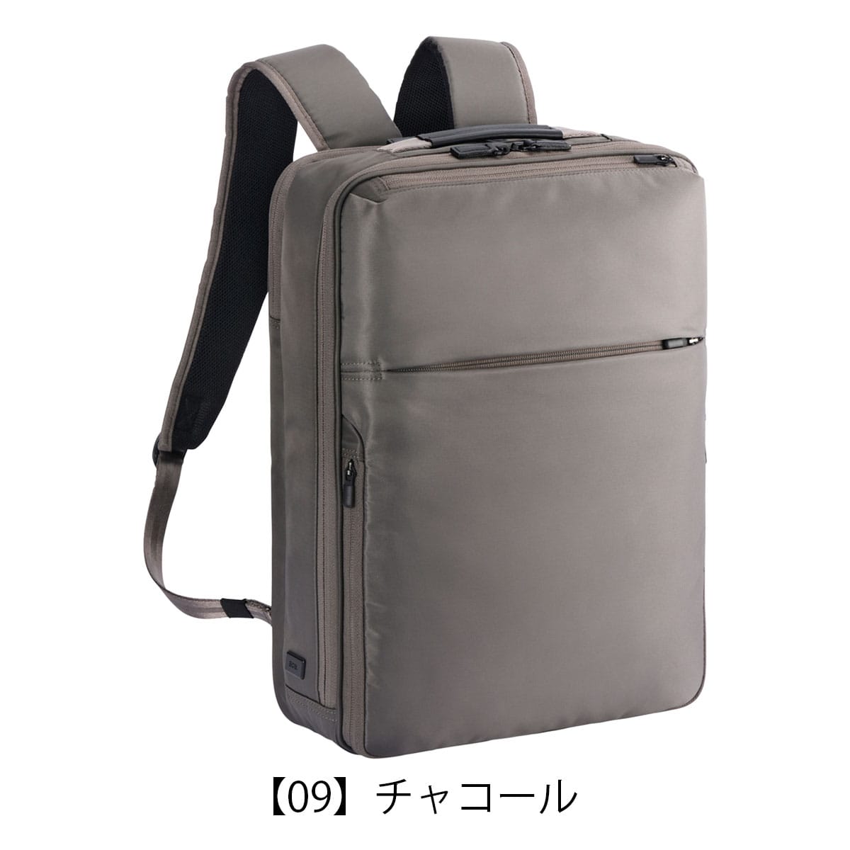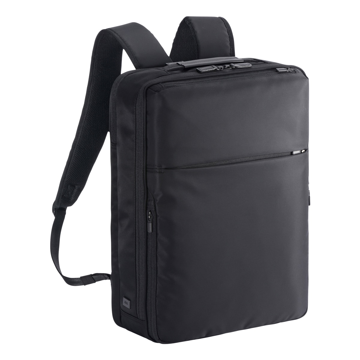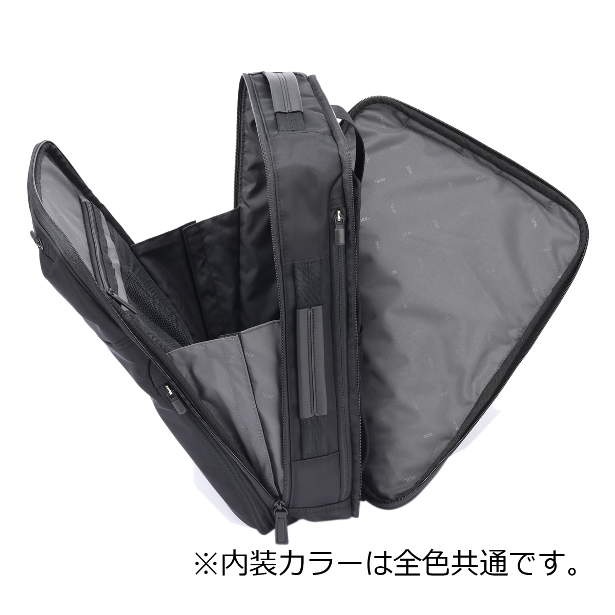 仕様:ダブルファスナー式開閉内側:ファスナーポケット×1メッシュポケット×2ペンホルダー×2ボトルホルダー×1スナップボタンポケット×1前面:ファスナーポケット×3(抗菌・抗ウイルス)背面:L字ファスナーポケット×1(内側:ベルクロ式PC収納ポケット×1)キャリーセットアップ