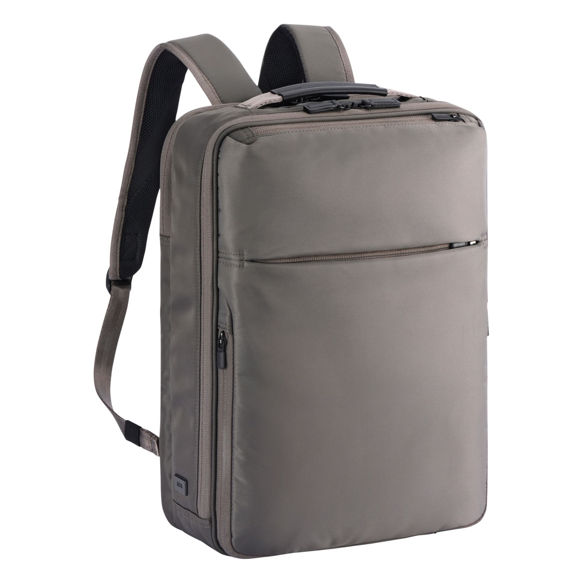 仕様:ダブルファスナー式開閉内側:ファスナーポケット×1メッシュポケット×2ペンホルダー×2ボトルホルダー×1スナップボタンポケット×1前面:ファスナーポケット×3(抗菌・抗ウイルス)背面:L字ファスナーポケット×1(内側:ベルクロ式PC収納ポケット×1)キャリーセットアップ