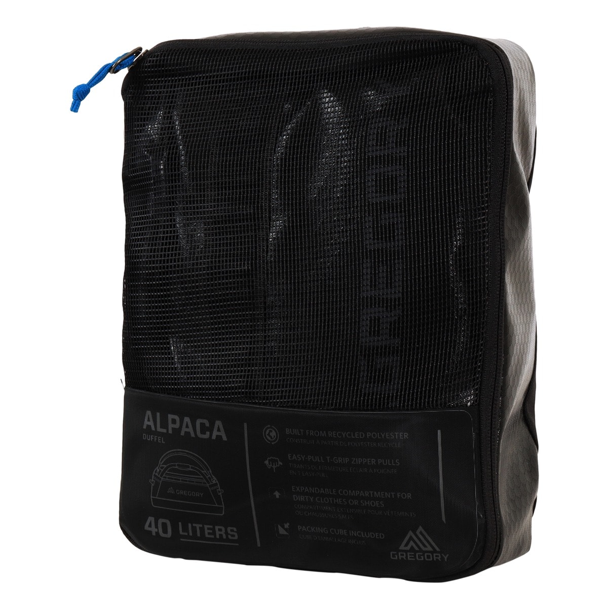 アルパカシリーズの中で最も小さい40リットルのダッフルパック。汚れた衣類などを分けて収納できる拡張可能なコンパートメント、T-Gripジッパープル、取り外し可能なショルダーストラップには高度な技術が採用されており、リサイクル素材と耐候性の高い生地によって、どこでも快適に安心して使用できます。