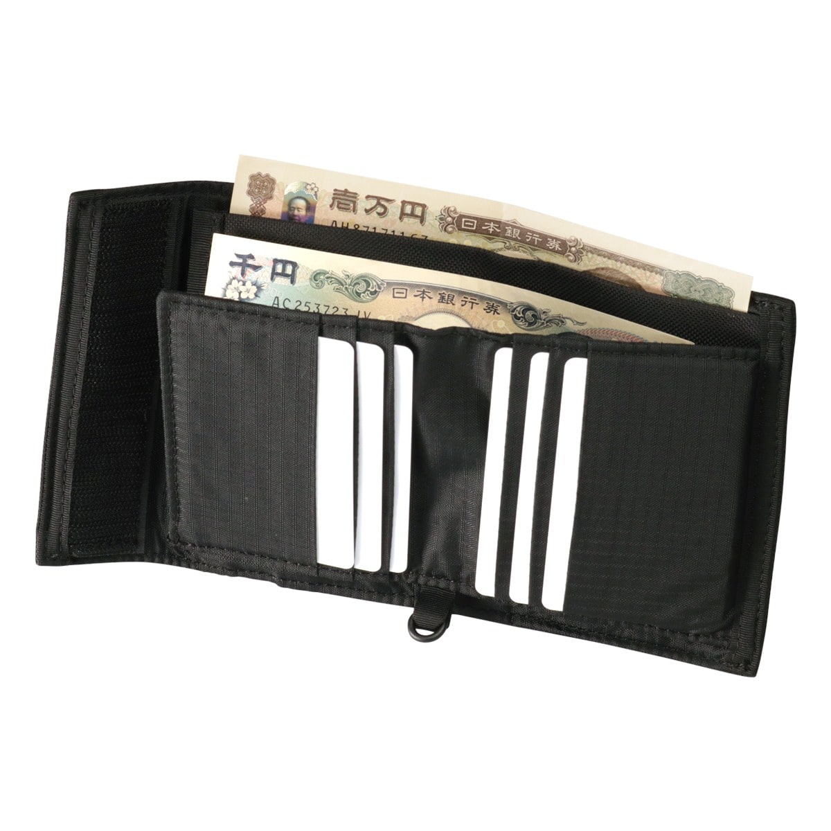 高級感のあるレザーパッチとメタル調コイルファスナー仕様の別注モデルです。IDなどのカード類の収納に便利なスリーブを豊富に備えた、ベルクロ開閉式のワレットです。紙幣の整理に便利な仕切りパネルやキーチェーン等への取り付けに便利なOリングも装備。アウトドアにも最適です。