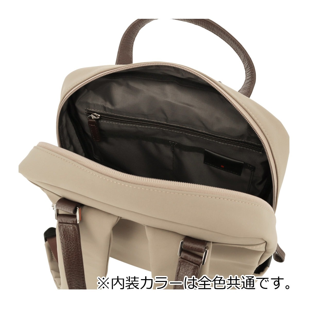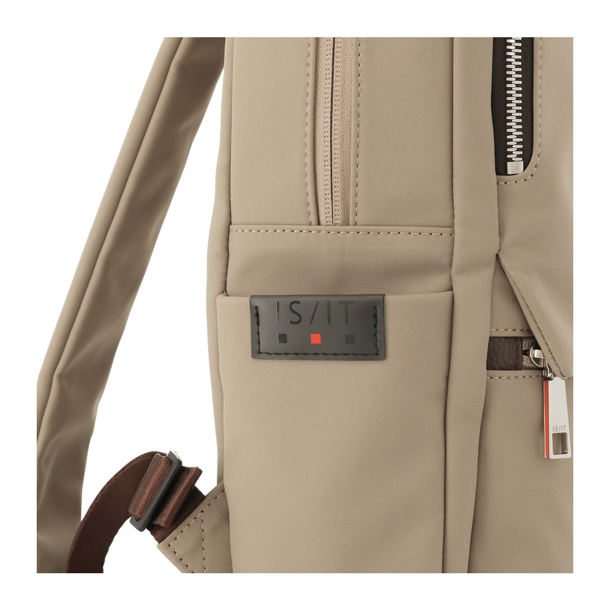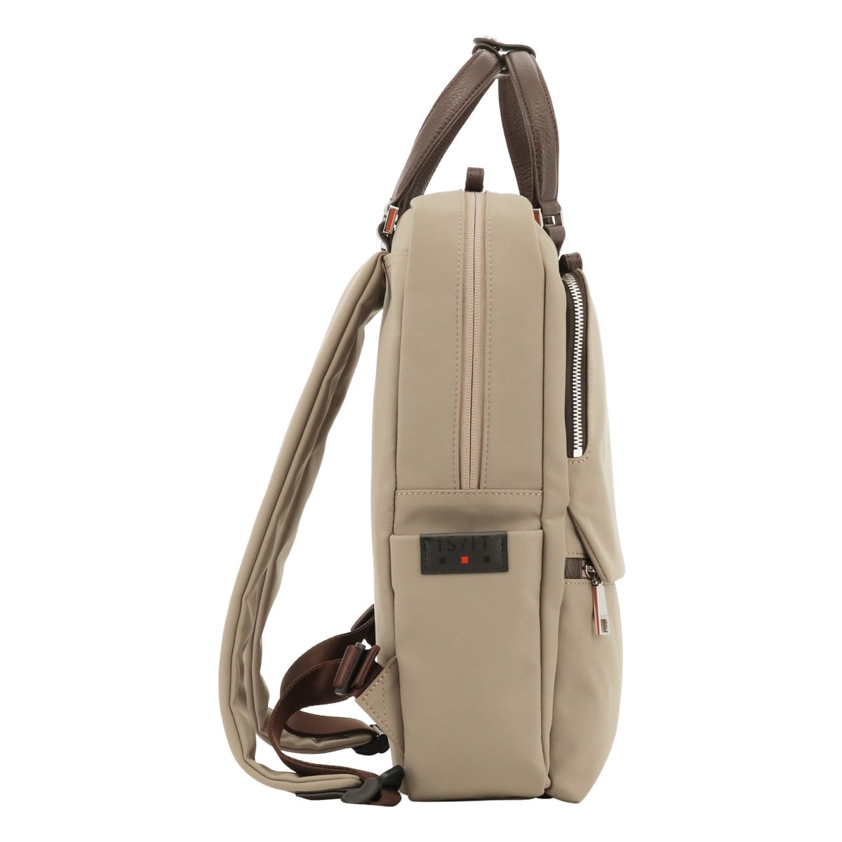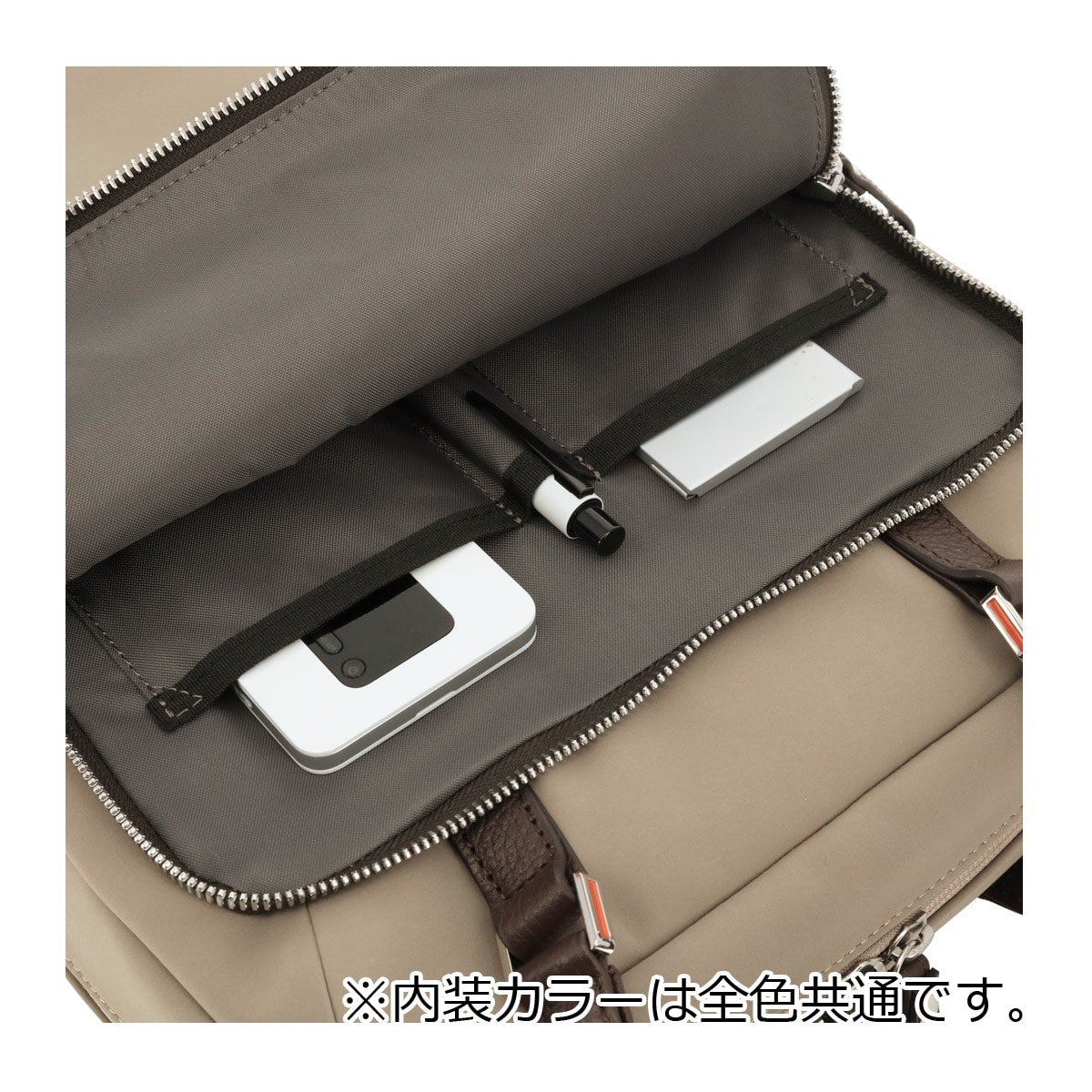 撥水加工されたポリエステル生地に特殊な裏加工を施し、より撥水性を高めて、軽量・ハリ感が両立したメイン素材にメイン収納部や背面ポケット等に撥水ファスナーを採用した晴れの日でも雨の日でも使いやすい軽量ビズリュックシリーズです。カフェなどの雨除け屋根(オーニング)をモチーフに、サイドにはパスケースなどがつけられるDカンやISITロゴのタグなど機能性を持ったジェンダーニュートラルなデザインがポイントです。