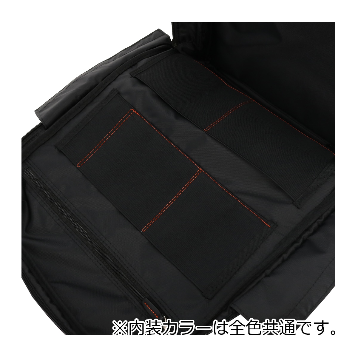 仕様:ダブルファスナー式開閉内側:ベルクロポケット×1ファスナーポケット×1フリーポケット×4ペンホルダー×1キーフック×1前面:ファスナーポケット×1(内側:フリーポケット×1)背面:ダブルファスナーポケット×1(内側:ベルクロ式PC収納ポケット×1)キャリーセットアップ側面:ファスナーポケット×1(内側防滴生地)