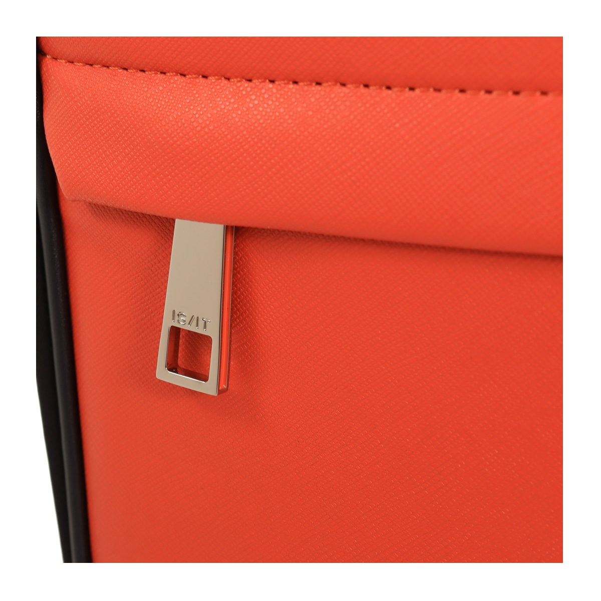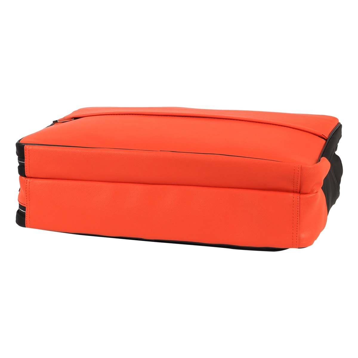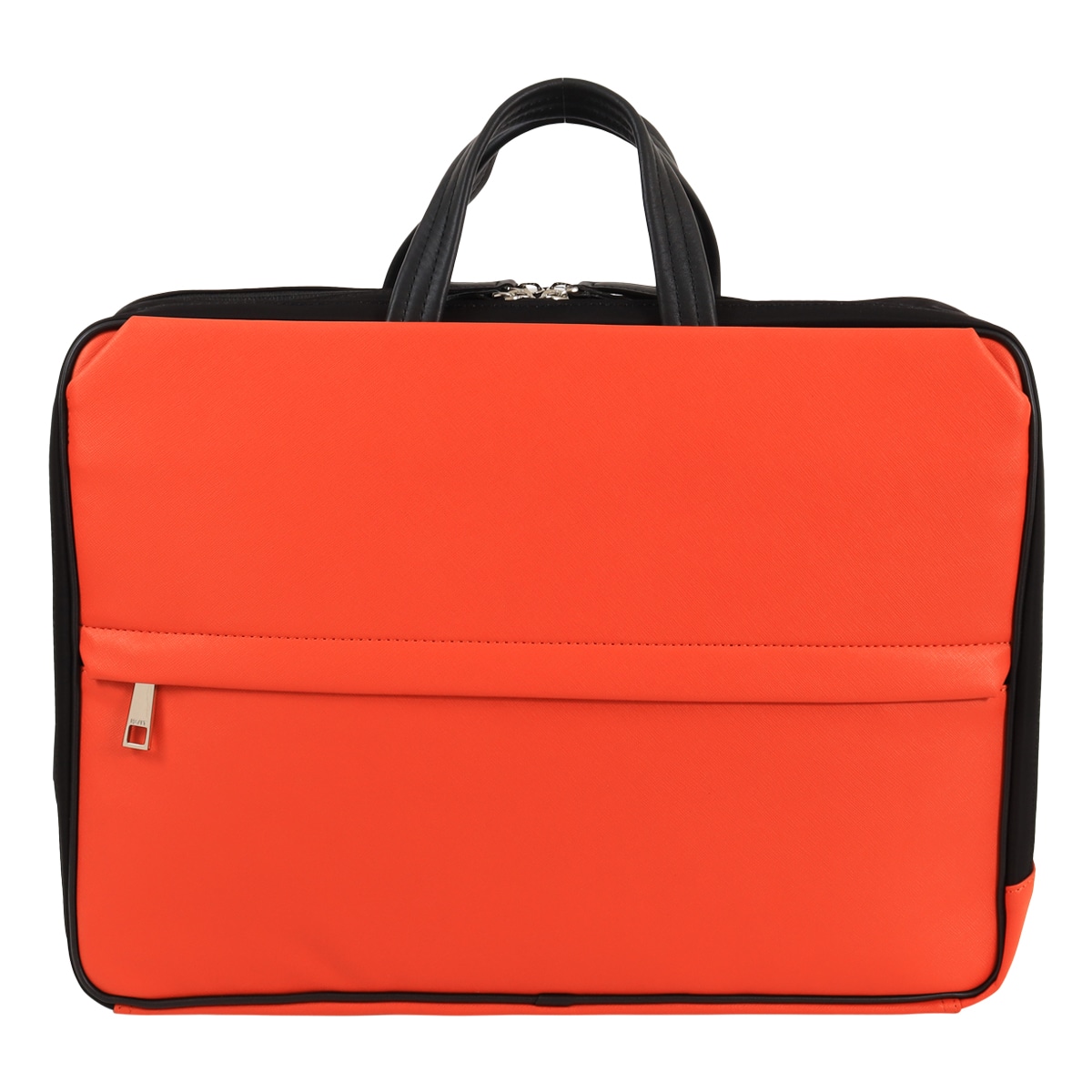 また、ビジネスバッグの前面にはアオリポケットがあり、新聞やサッと取り出したい小物の収納に便利です。フロントのファスナーポケットは浅型に設計しており、さらに内側は見やすいオレンジ色のパイル生地を使用することで、スマートフォン等を入れても画面を傷つける心配がありません。