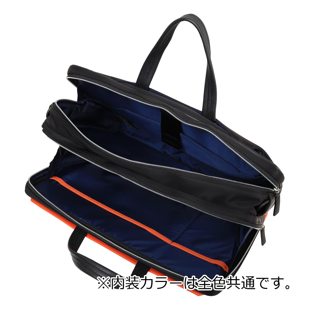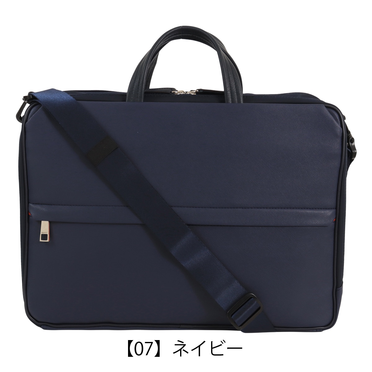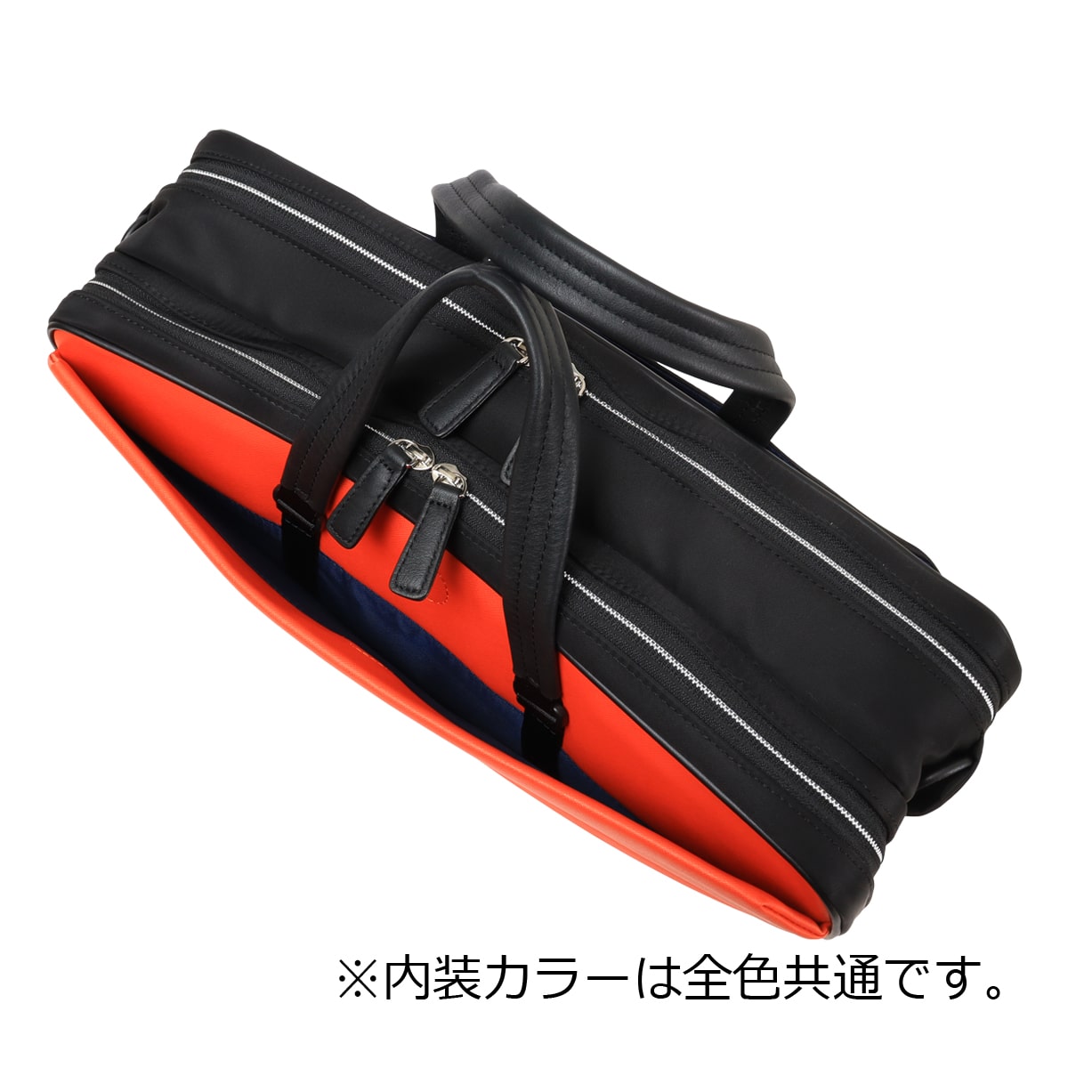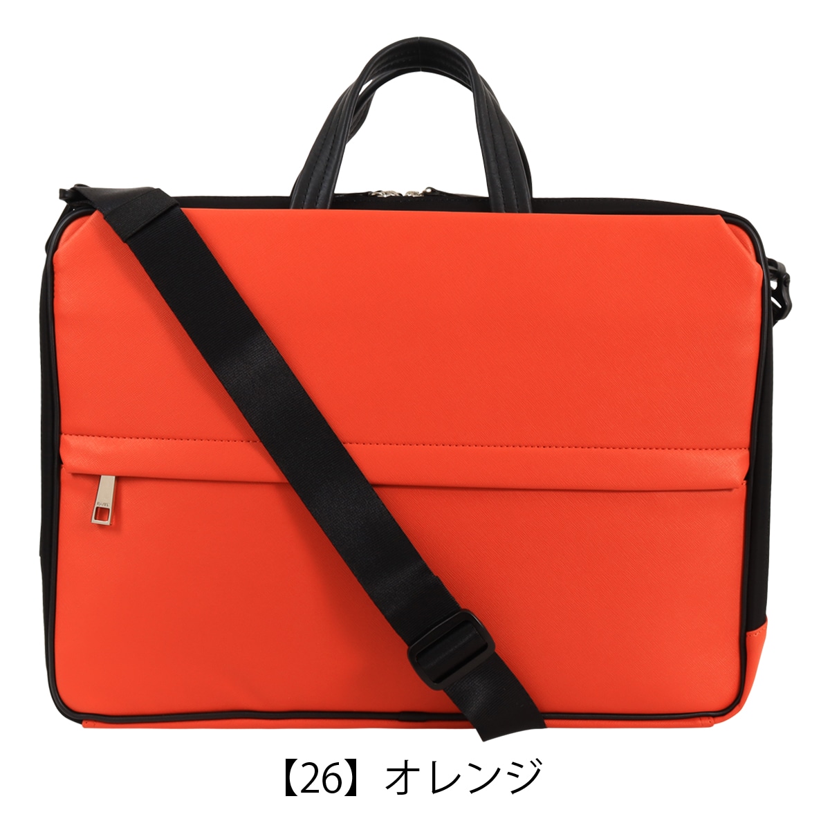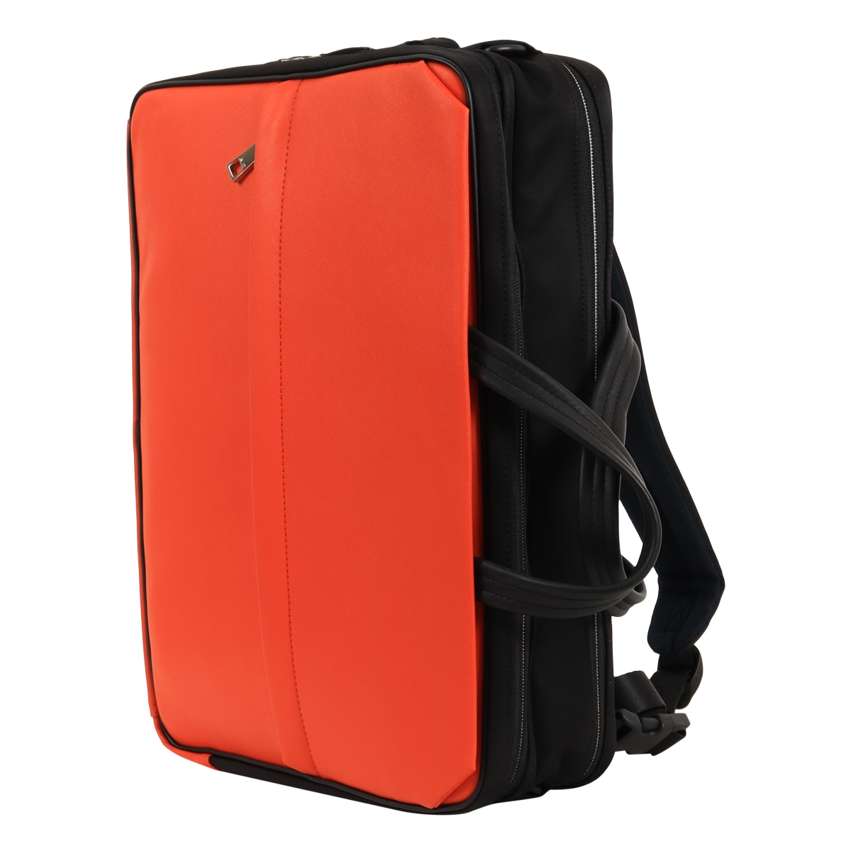 前面にはサフィアーノ型合成皮革を、ハンドルには手に馴染む牛革を、そしてマチと背面にはナイロンを使用した異素材コンビでスッキリとしたデザインのB4サイズの3WAYビジネスバッグ。2層タイプで1泊2日の出張にも対応した大容量なビジネスバッグです。シーンに合わせて、リュックやショルダーとしてもお使いいただけます。豊富な収納ポケットで、ビジネスに必要なあらゆる荷物の持ち運びが可能です。B4ファイルがすっぽり収まるメインコンパートメントは前室と後室に分かれた2層タイプ。1泊2日の出張にも対応した大容量なビジネスバッグです。前室にはファスナーポケットが1つ、大中小のポケットが1つずつ装備されています。ガジェット類など細かな荷物を整理して収納が可能です。後室には15インチPC収納対応ポケットがあり、出張先にもPCを持ち運ぶことができます。また、ビジネスバッグの前面にはアオリポケットがあり、新聞やサッと取り出したい小物の収納に便利です。フロントのファスナーポケットは浅型に設計しており、さらに内側は見やすいオレンジ色のパイル生地を使用することで、スマートフォン等を入れても画面を傷つける心配がありません。