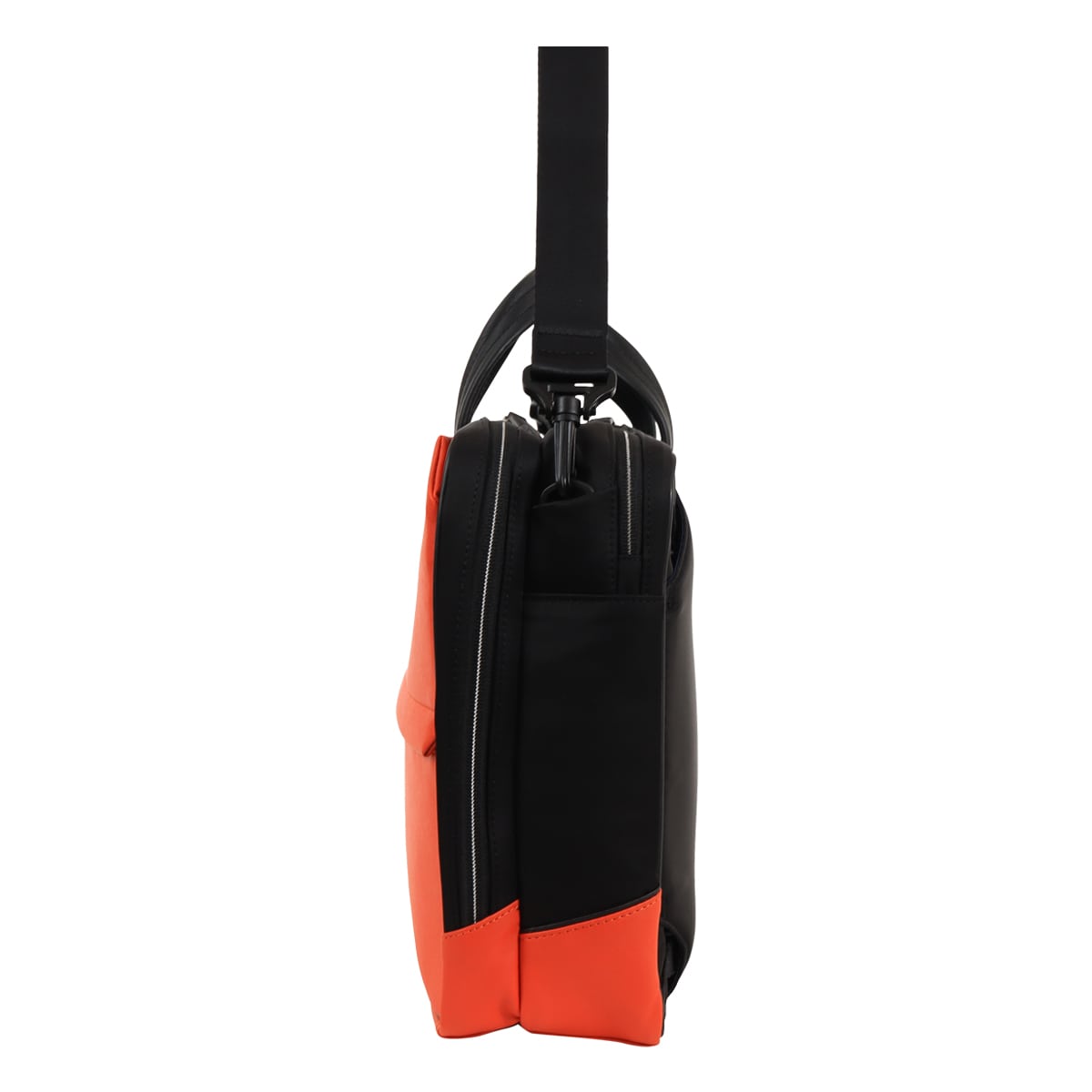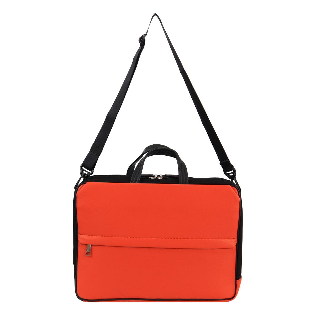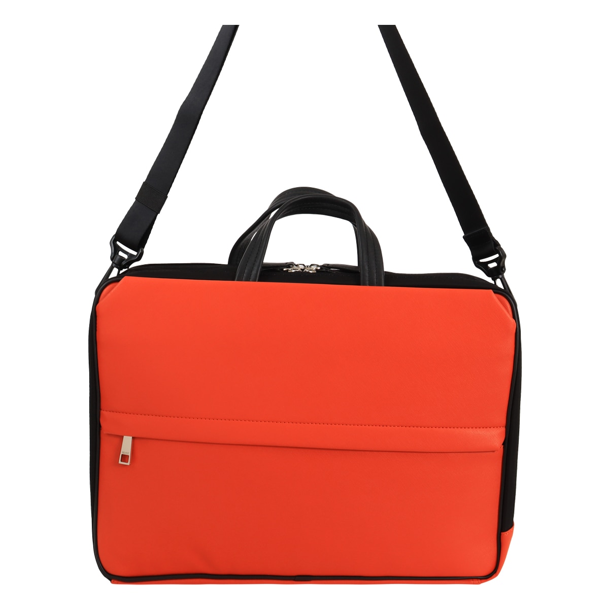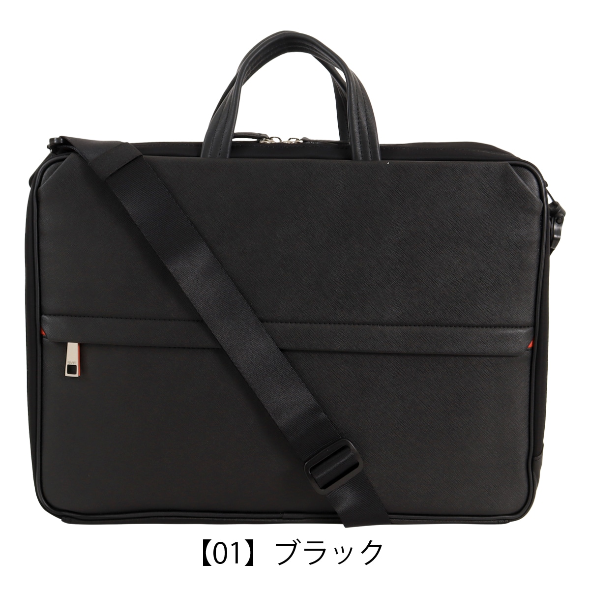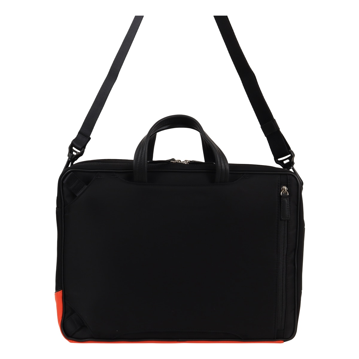 前面にはサフィアーノ型合成皮革を、ハンドルには手に馴染む牛革を、そしてマチと背面にはナイロンを使用した異素材コンビでスッキリとしたデザインのB4サイズの3WAYビジネスバッグ。2層タイプで1泊2日の出張にも対応した大容量なビジネスバッグです。シーンに合わせて、リュックやショルダーとしてもお使いいただけます。豊富な収納ポケットで、ビジネスに必要なあらゆる荷物の持ち運びが可能です。B4ファイルがすっぽり収まるメインコンパートメントは前室と後室に分かれた2層タイプ。1泊2日の出張にも対応した大容量なビジネスバッグです。前室にはファスナーポケットが1つ、大中小のポケットが1つずつ装備されています。ガジェット類など細かな荷物を整理して収納が可能です。後室には15インチPC収納対応ポケットがあり、出張先にもPCを持ち運ぶことができます。また、ビジネスバッグの前面にはアオリポケットがあり、新聞やサッと取り出したい小物の収納に便利です。フロントのファスナーポケットは浅型に設計しており、さらに内側は見やすいオレンジ色のパイル生地を使用することで、スマートフォン等を入れても画面を傷つける心配がありません。
