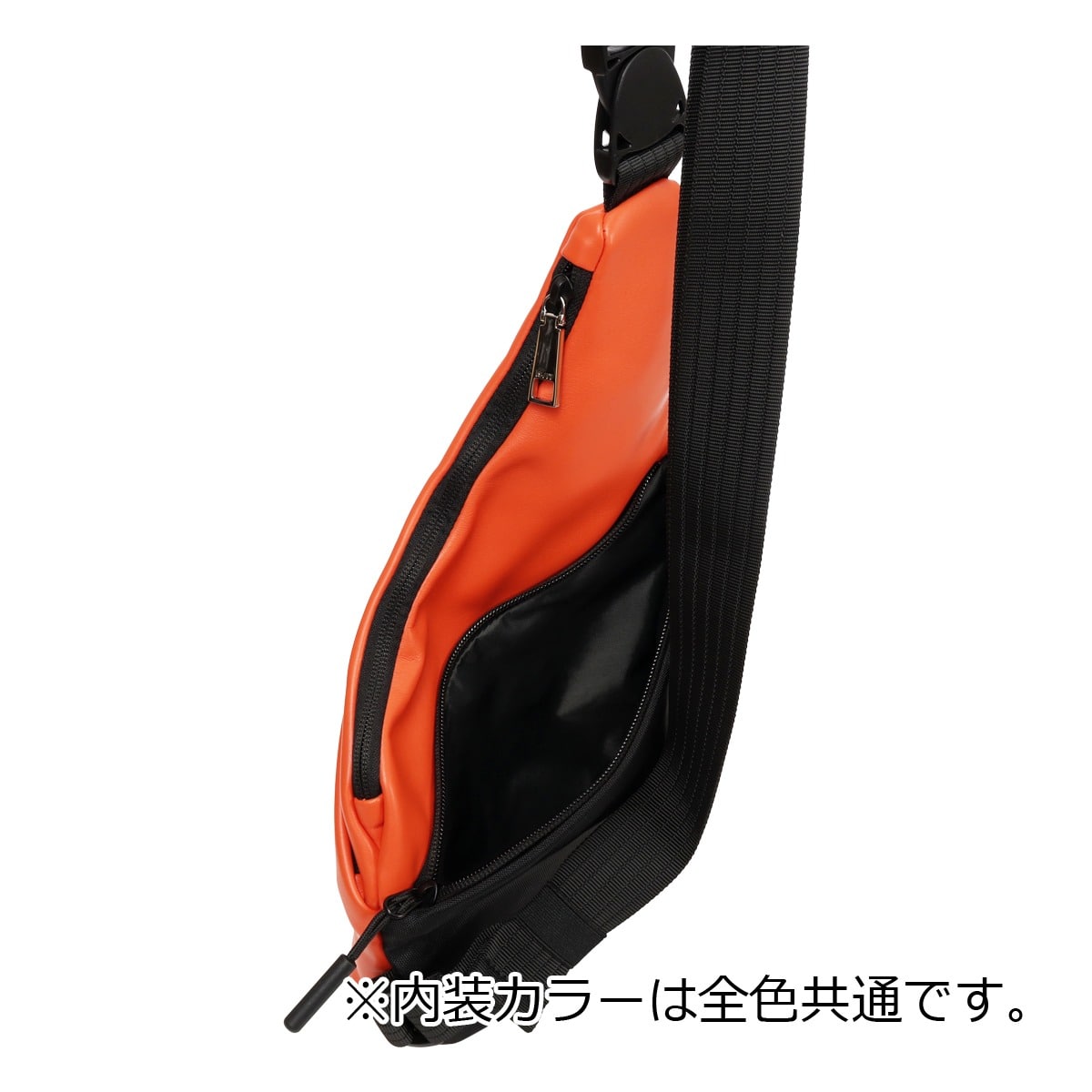 雨でも安心なタッチ感の良いソフトな合成皮革とファスナーは撥水コイルを使用しているため、雨の日でも安心。表はシンプルなデザインながらも前背ポケット付で使いやすく、バックルは回転式でお好きな角度で体になじむフィット感も魅力です。ペットボトルがタテに入るサイズ感。長財布・折り畳み傘・スマホなど入ります。薄型のためジャケットなどアウターの中に掛けても邪魔にならず防犯にも最適。
