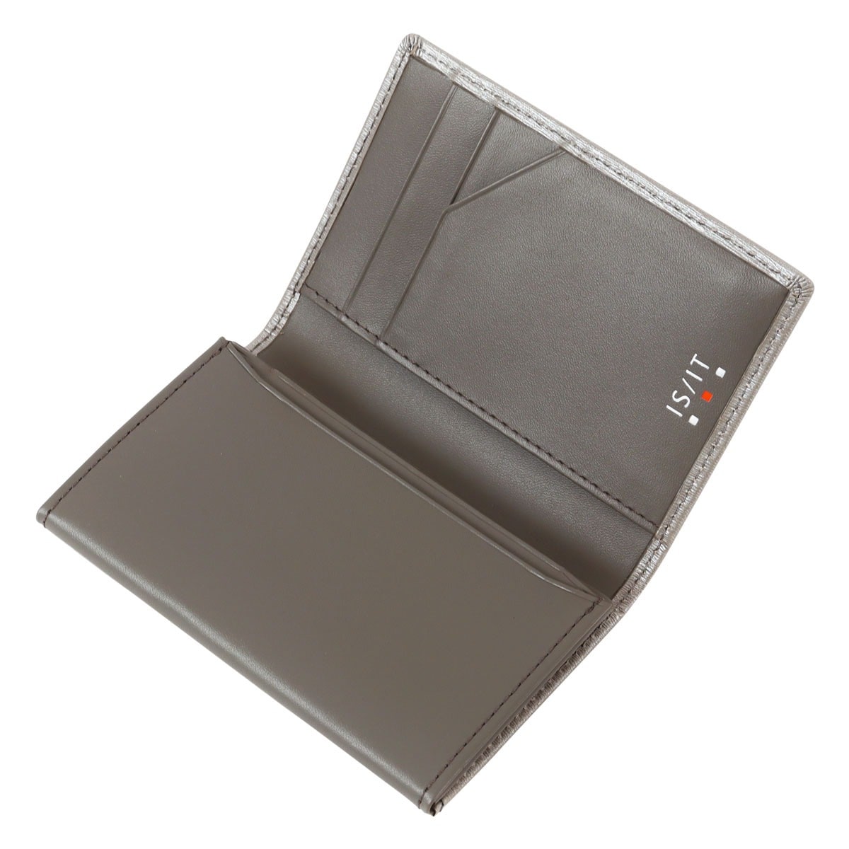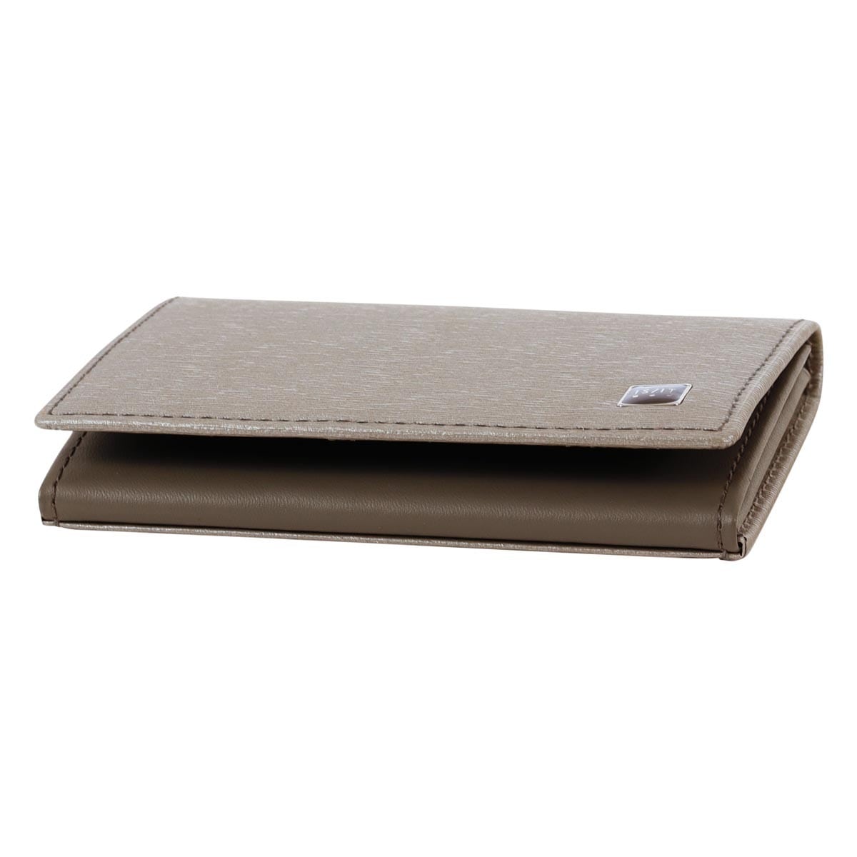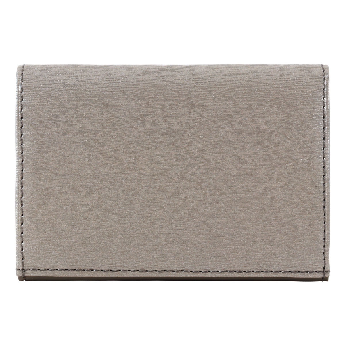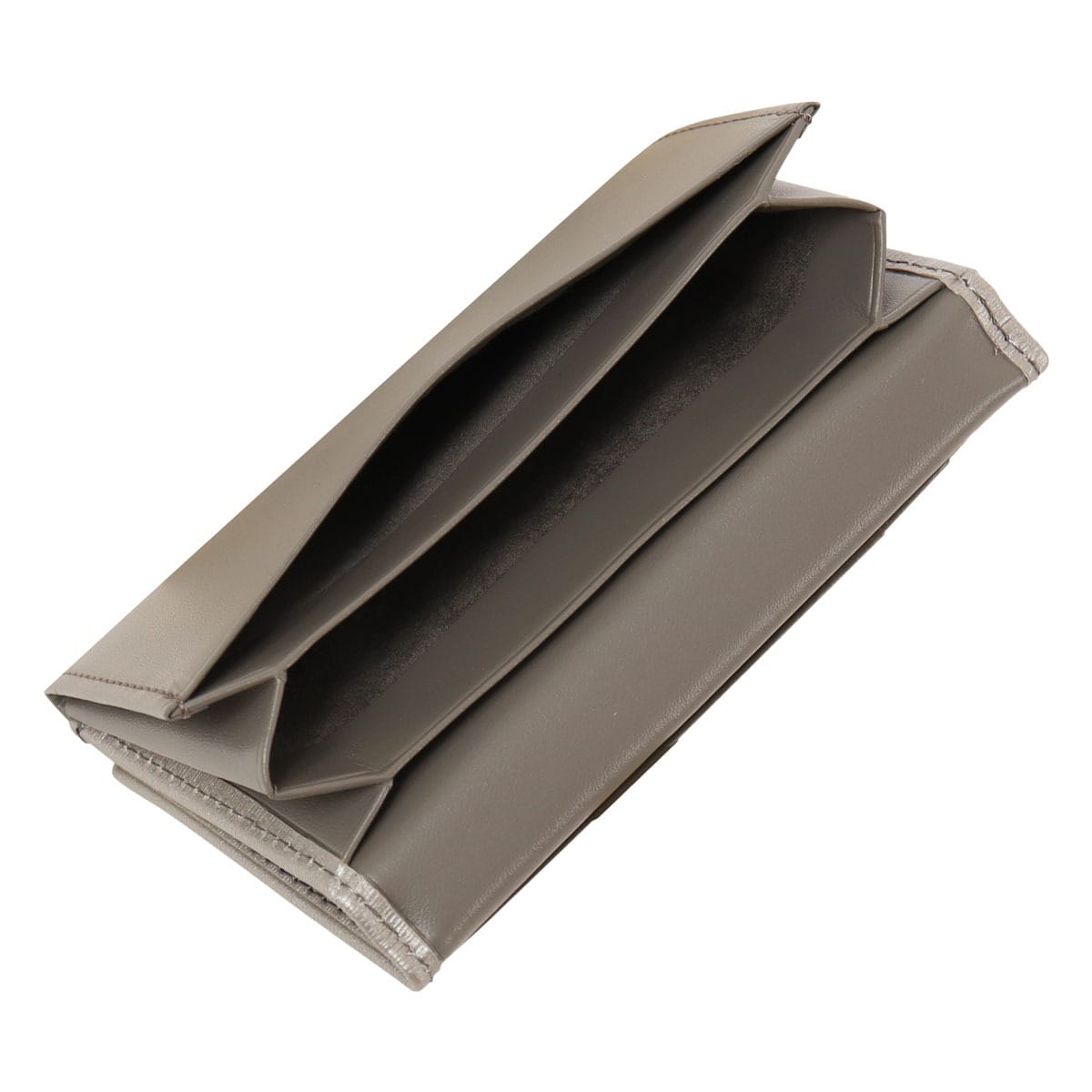 美しい繊細な水シボエンボス加工が施されたレザーを使用しており、水が流れた跡のような上品な模様が特徴です。また、傷や汚れが付きにくく多少の水気にも強い性質を持っているため、日常使いにも安心してお使いいただけます。内装には本体と同色のスムースレザーが使われており、トーン・トーン配色が落ち着いた大人の雰囲気を演出しています。高級感のある立体的なエポキシ樹脂で作られたロゴブローチで、滑らかな光沢感が高級感を一層引き立てます。