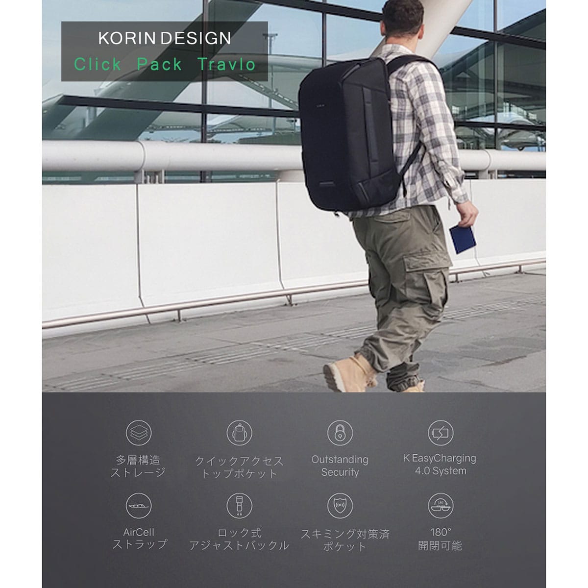 - > KORIN DESIGN 【1年保証】 コリンデザイン リュック メンズ レディース Travlo ClickPack バックパック トラベルバッグ 旅行 出張 トラベル 大容量 撥水 セキュリティ ワイヤーロック 盗難防止 TSAロック 高機能 ブラック